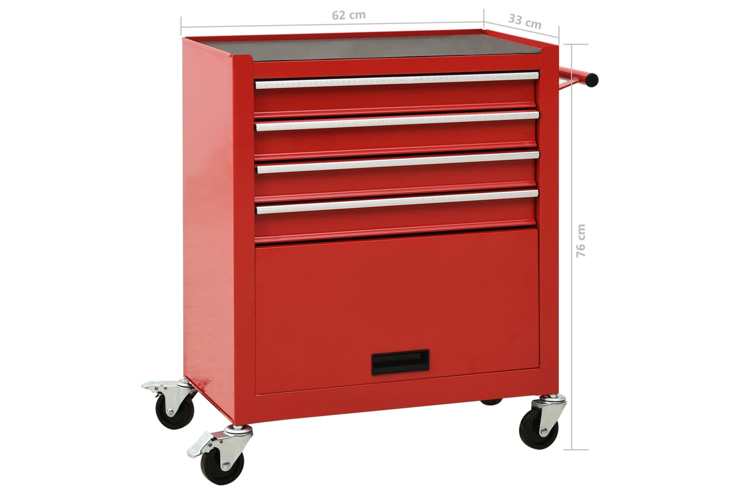 Made of steel, this trolley is sturdy and stable. The drawer has an interlocked function, which prevents more than one drawer being opened at once. Hence, you can only open one drawer at a time. Two of the swivel castors have brakes. The robust countertop on the tool cabinet is a great spot to keep frequently-used tools within reach. There is also a convenient side handle for pushing the trolley.