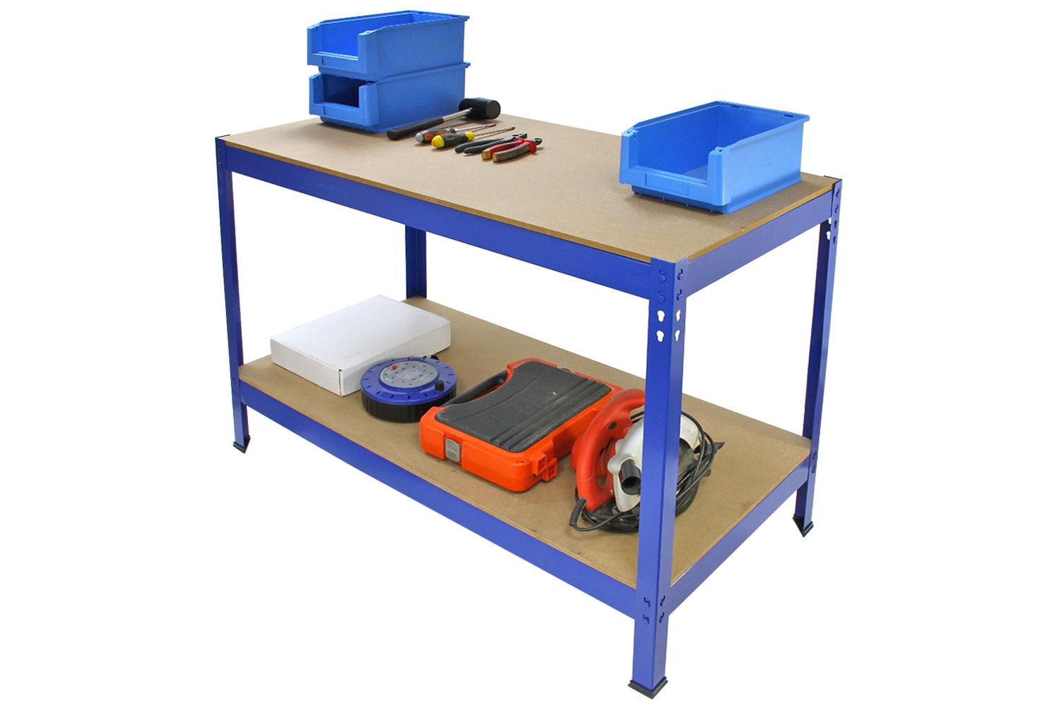 The sophisticated look of the Q-Rax workbench, with its steel frame in charismatic blue hue, enhances its appeal. Complementing the strength of the frame are the highly dense MDF shelves, offering not just durability but also a smooth workspace.