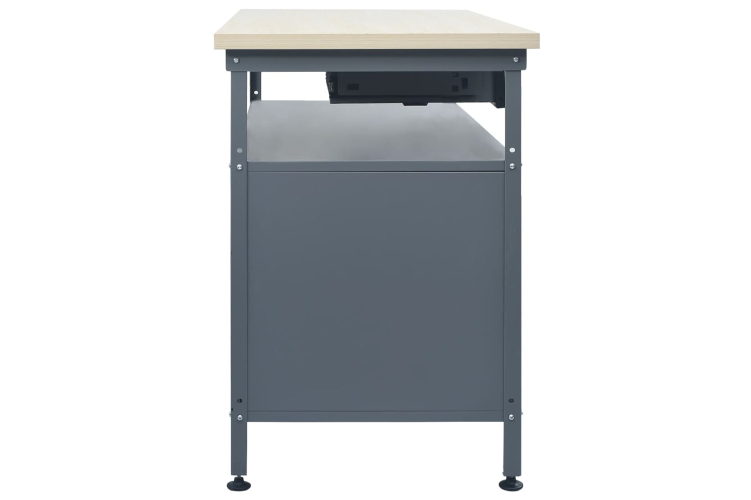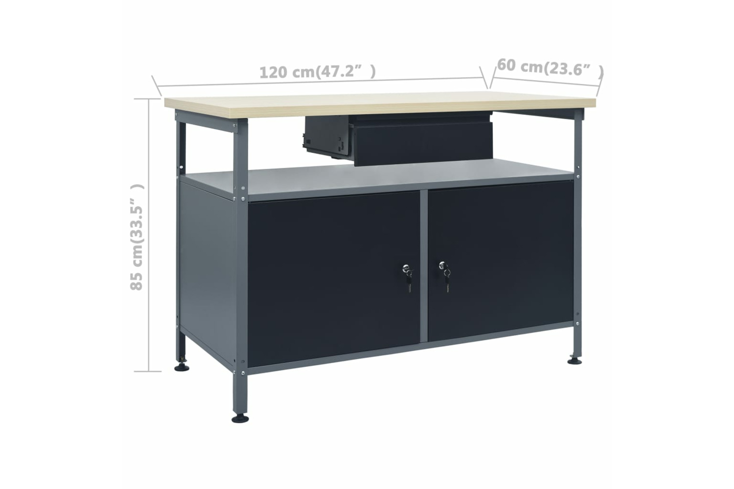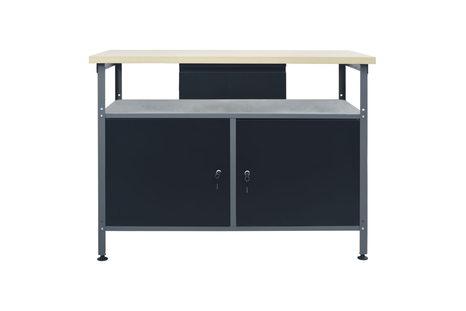 The large and sturdy tabletop provides a stable platform for all your repair works. The workbench has an open compartment equipped with a drawer, ensuring that you can organize your tools, parts and accessories such as screws, nails and adhesive tape well. There are suitable compartments for larger tools, the 2 cabinets with lockable doors, which can easily accommodate drills, cable drums and grinders.