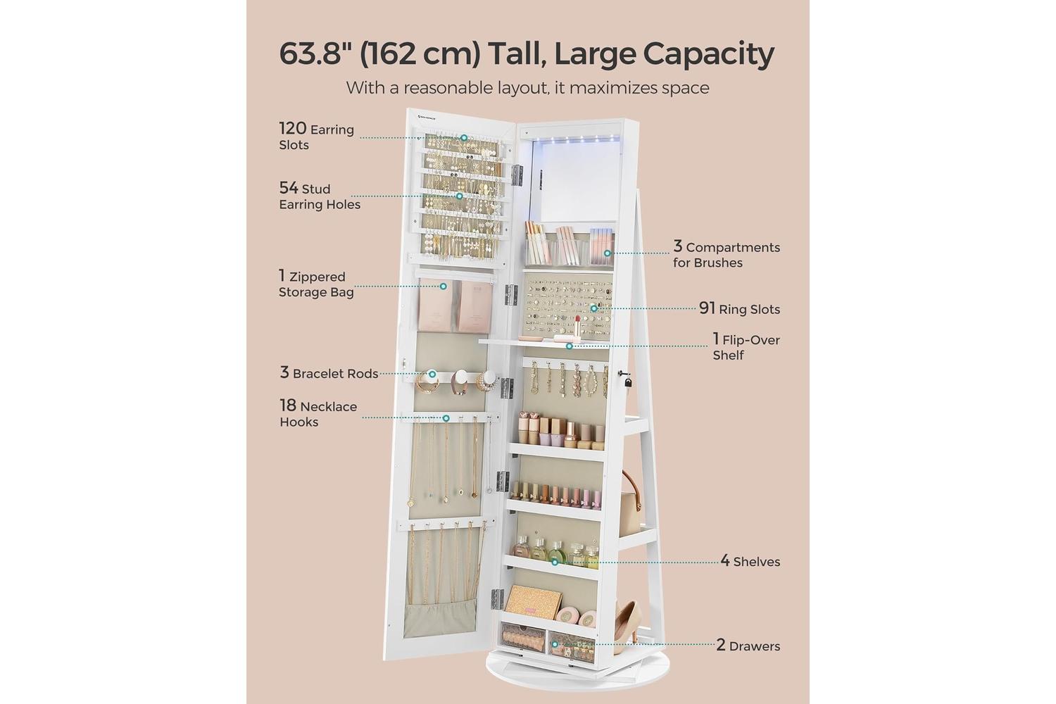 Standing tall at 162 cm, this spacious jewellery armoire provides ample room for all your rings, necklaces, bracelets, and more. The full-length mirrored door not only helps you choose the perfect piece but also adds a touch of sophistication to your space. Inside, the plush velvet lining protects your valuables from scratches, while the thoughtfully designed compartments keep everything organised and easy to find. Whether you are preparing for a busy workday or a special night out, this cabinet ensures your favourite pieces are always at your fingertips.