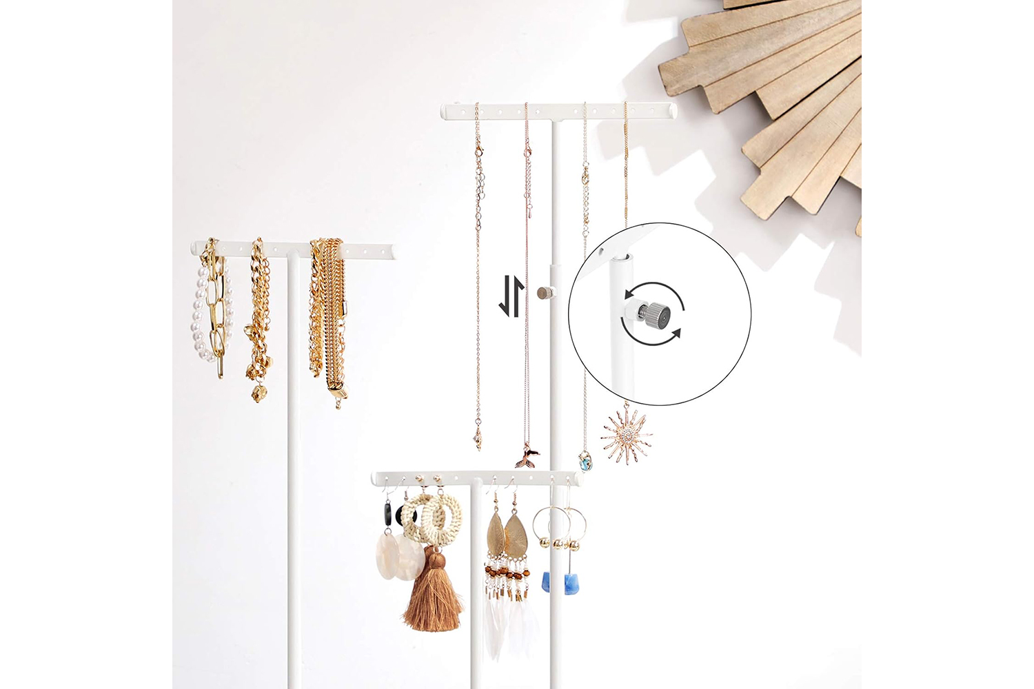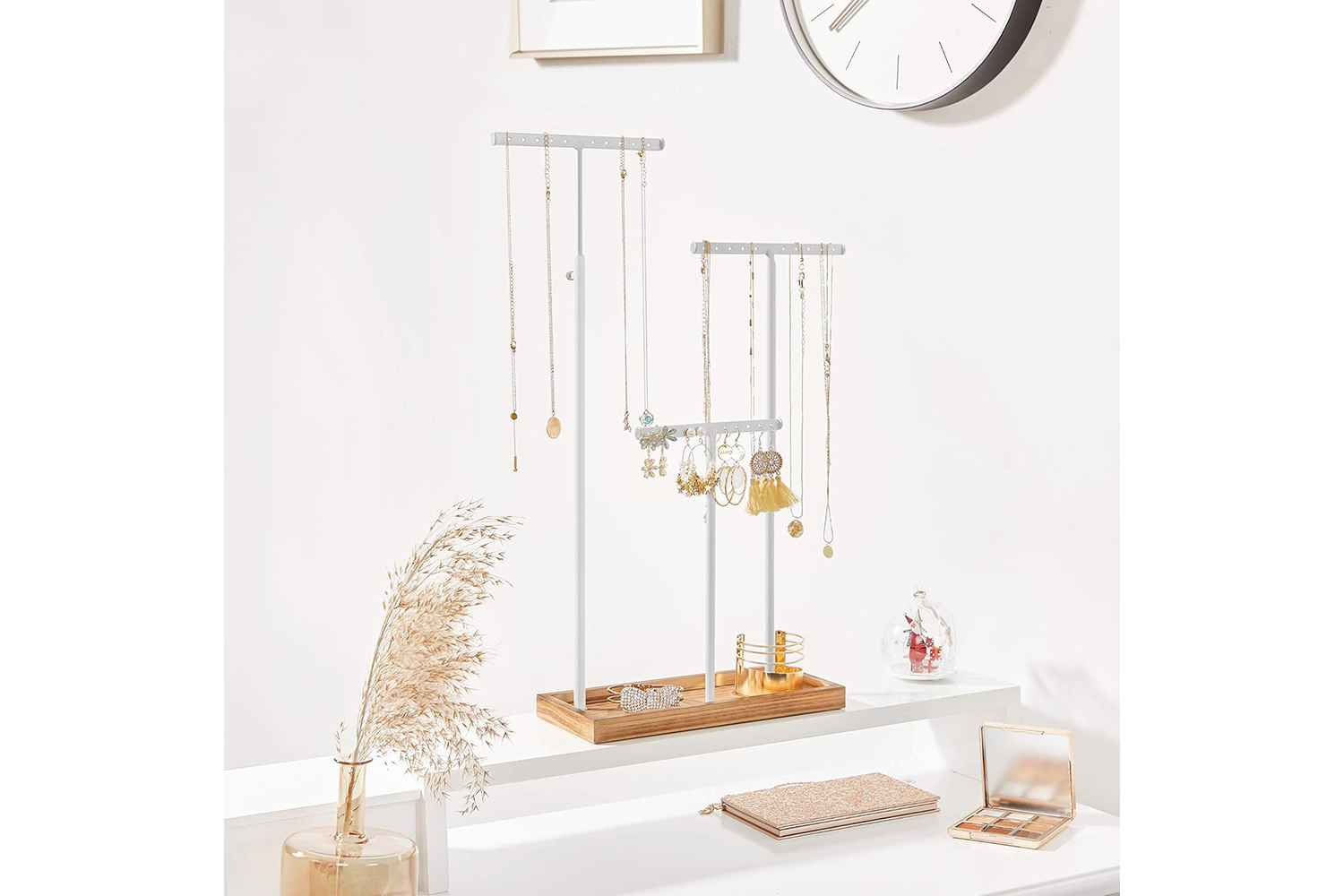 Make tangled necklaces a thing of the past with this jewellery rack with 3 bars in different heights! One of the bars can be adjustable from 40-54 cm, so even your long necklaces can find their home too!