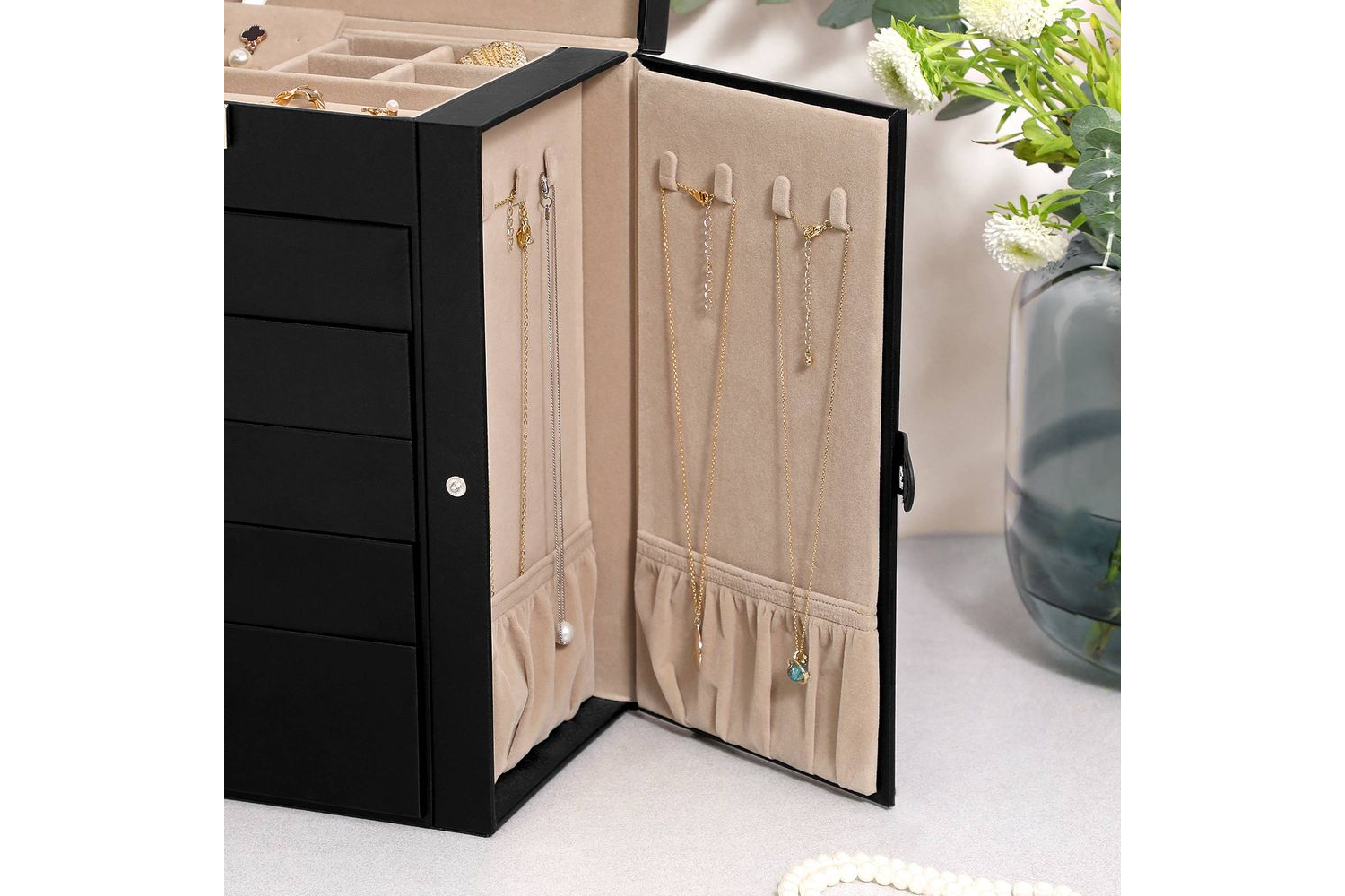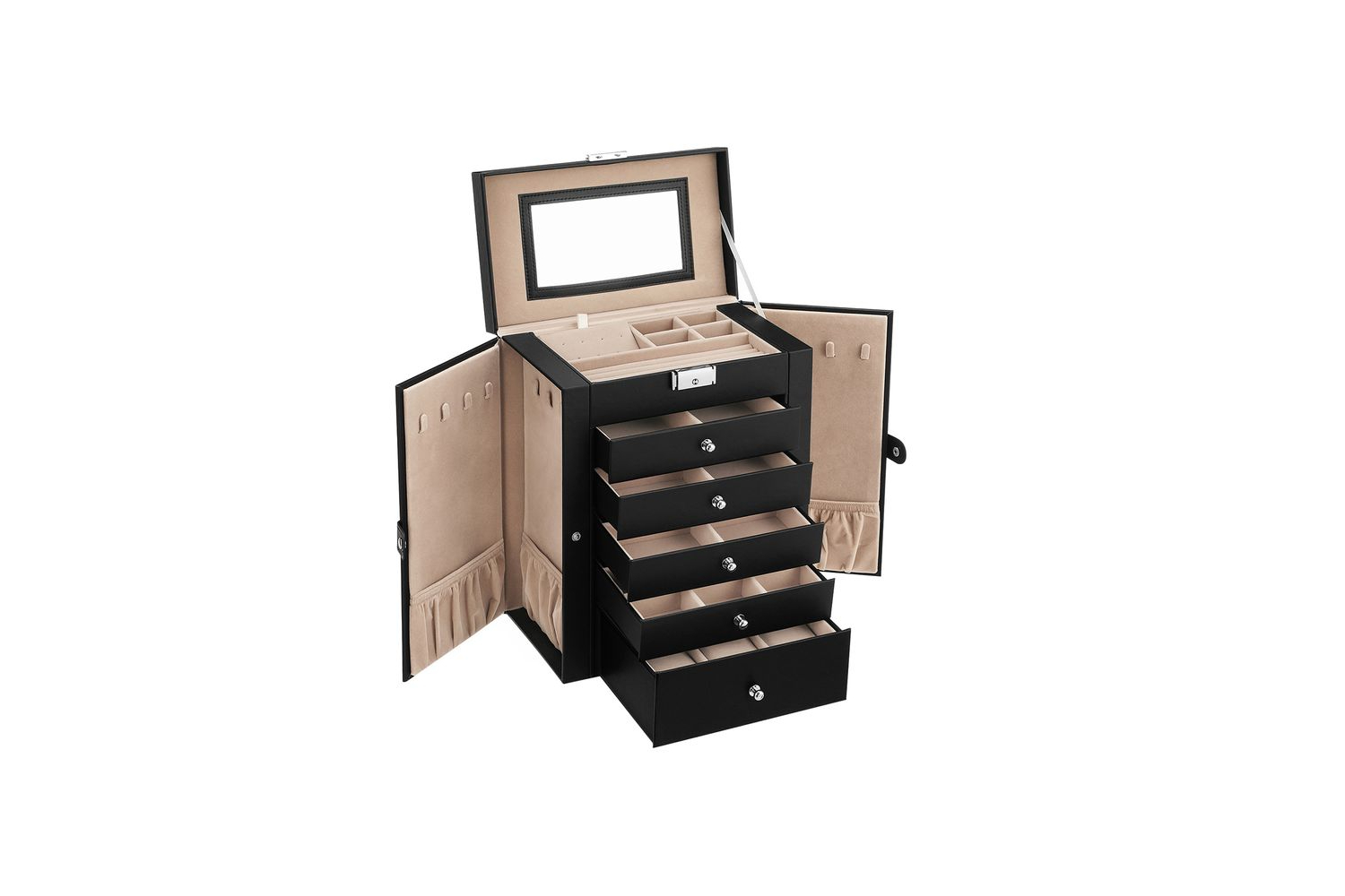 [6 Tiers, Spacious] This 6-tier jewellery box boasts multiple layers with different compartments and layouts to keep all your jewellery, like stud earrings and rings, sorted and organised; the deep bottom drawer fits 3 watches and a pair of sunglasses[4 Rows of Hooks for Necklaces] 4 rows of hooks in an ideal height hang up your necklaces perfectly, even the longer ones, without making you worry about untangling these necklaces the next time you want to wear them[With Inner Mirror and Lock] The jewellery case has a mirror inside that allows you to do your makeup and check your look easily, saving precious morning time; it has a lock with 2 keys to keep your valuables away from naughty kids[Quality and Durable] Smooth PU surfaces, sturdy MDF body, soft velvet lining, neat stitchingthis lockable jewellery organiser is sturdy and durable to accompany you for years to come[Fancy Gift Idea] Gift this well-crafted, stylish jewellery holder to loved ones for their birthday or anniversary to surprise them! Or, treat yourself to this charming jewellery boxyou deserve it!Specifications: - Colour: Black- Material: MDF (Medium Density Fibreboard) Frame, PU (Polyurethane) Exterior, Velvet Interior- Product Size: 26 x 15.5 x 32 cm (L x W x H)- Product Weight: 3.2 kg Package Contents:- 1 x Jewellery Box