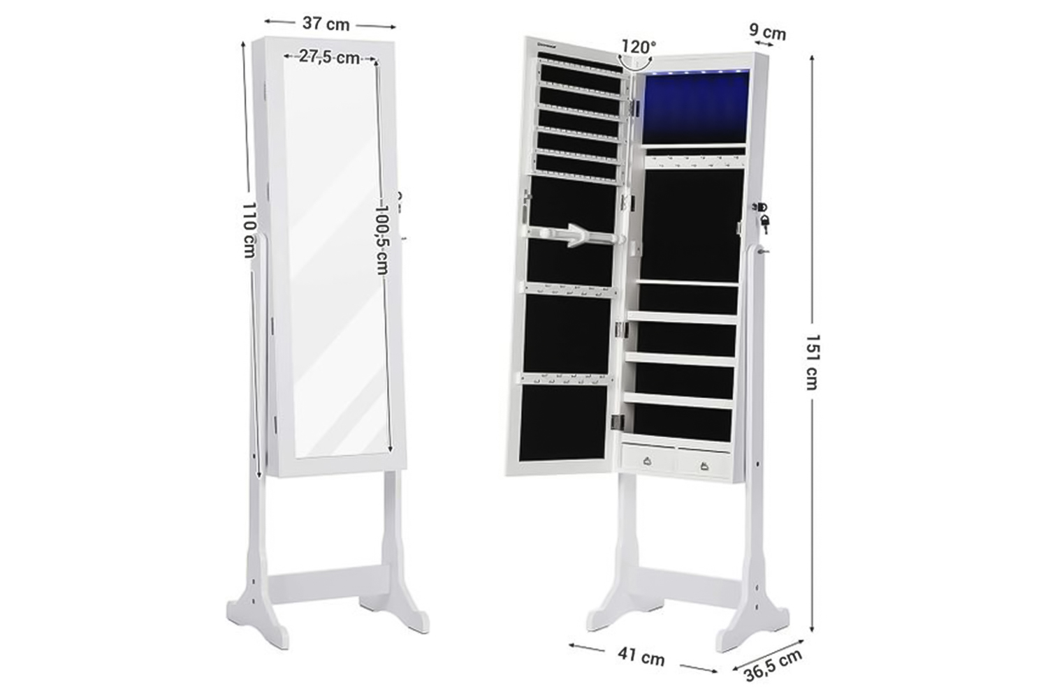Songmics jewelry cabinet with LED lighting, lockable cabinet with mirror, standing mirror, 5 shelves and 2 small drawers, white JBC94W.