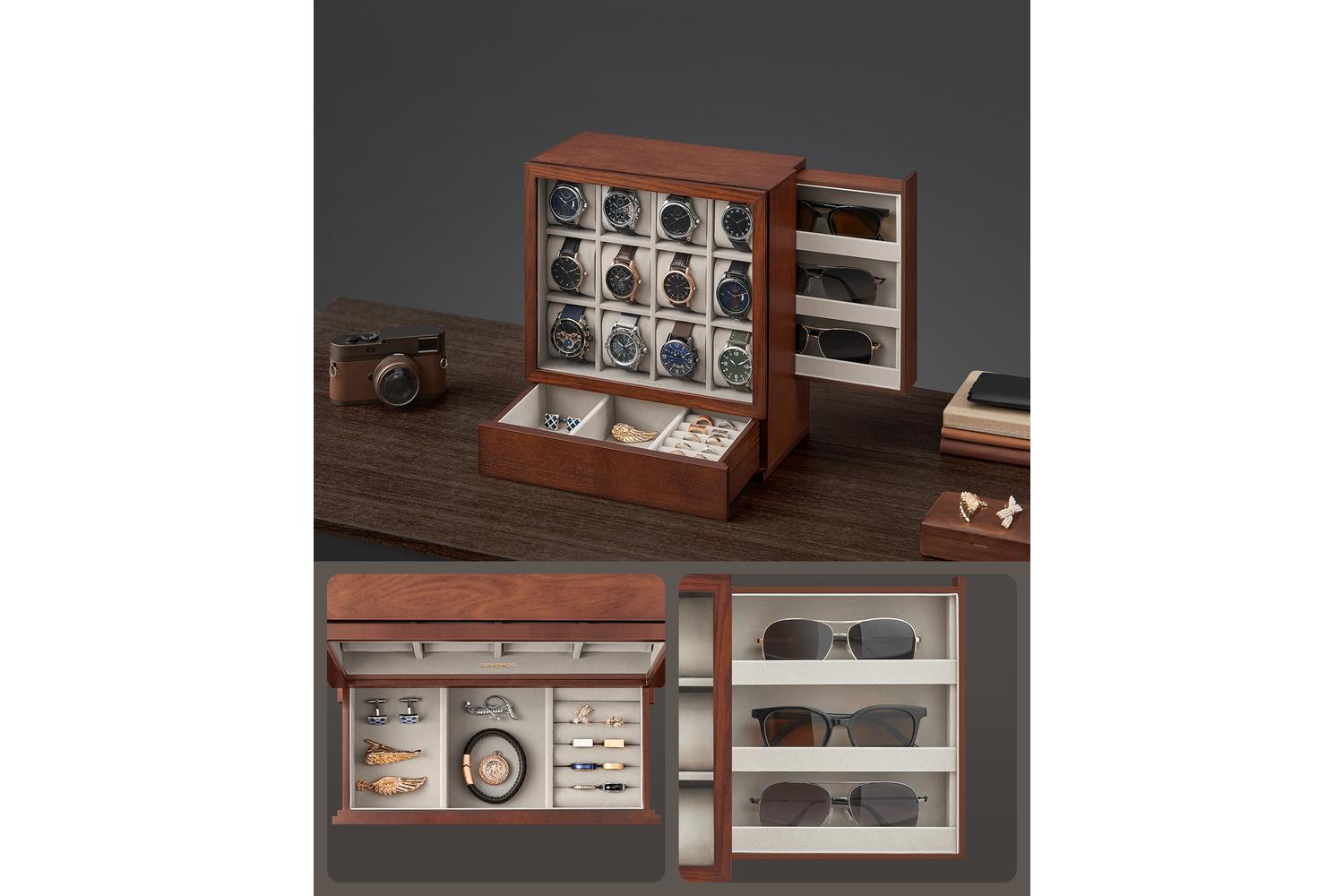 With 12 spacious slots, each accommodating watches with dials up to 56 mm, you will never have to worry about running out of room for your expanding collection. The soft velvet lining cradles your watches, preventing scratches and ensuring they remain in pristine condition. Beyond watches, this organiser features a hidden side drawer for sunglasses and bowties, plus a convenient bottom drawer for rings and bracelets, making it a versatile addition to any dresser or wardrobe. Simplify your daily routine and keep all your essentials in one stylish place.