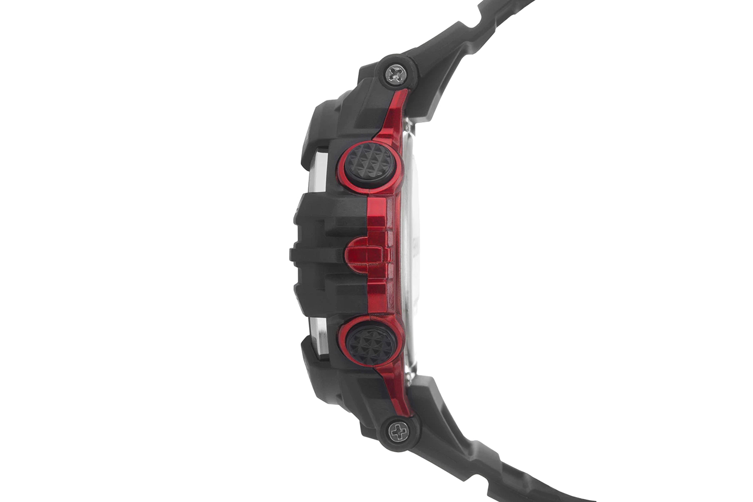 Ensconced within a sturdy black and red plastic case, lies a crisp digital black dial with stark white markings; a backdrop that is effortlessly clean yet supplied with a bold sophistication. Furthermore, offering a snuggle fit is a comfortable black plastic strap, ensuring it stays intact during both domestic and sports activities throughout your day.