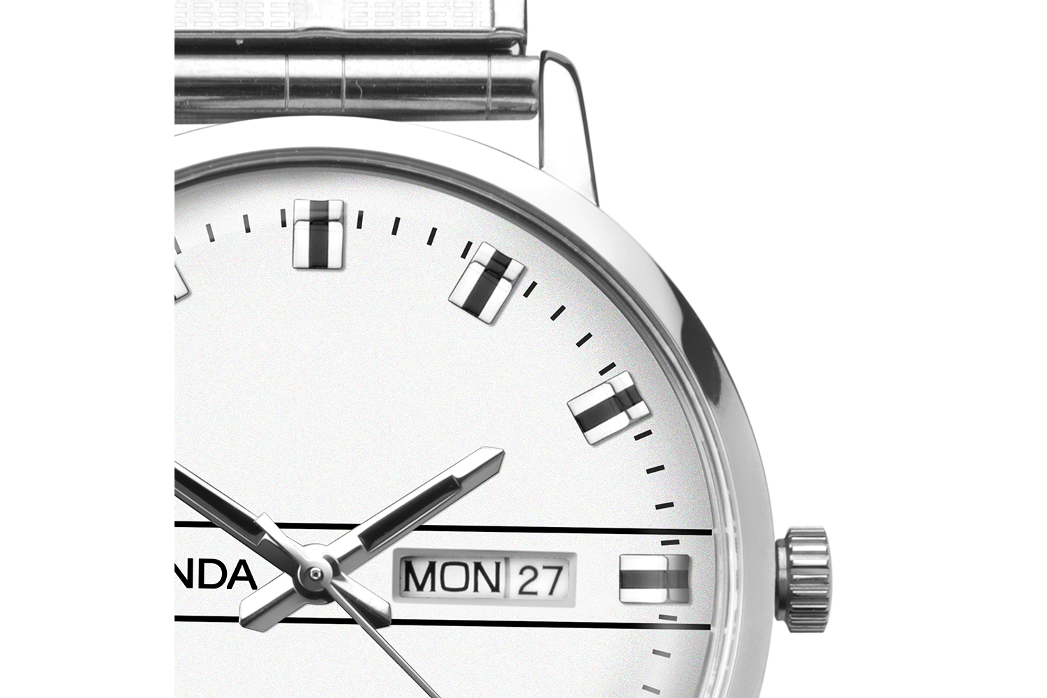 - Elegant silver sunray dial with a convenient date function