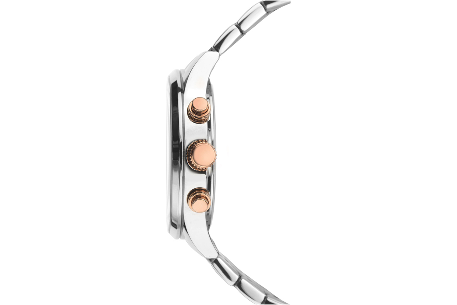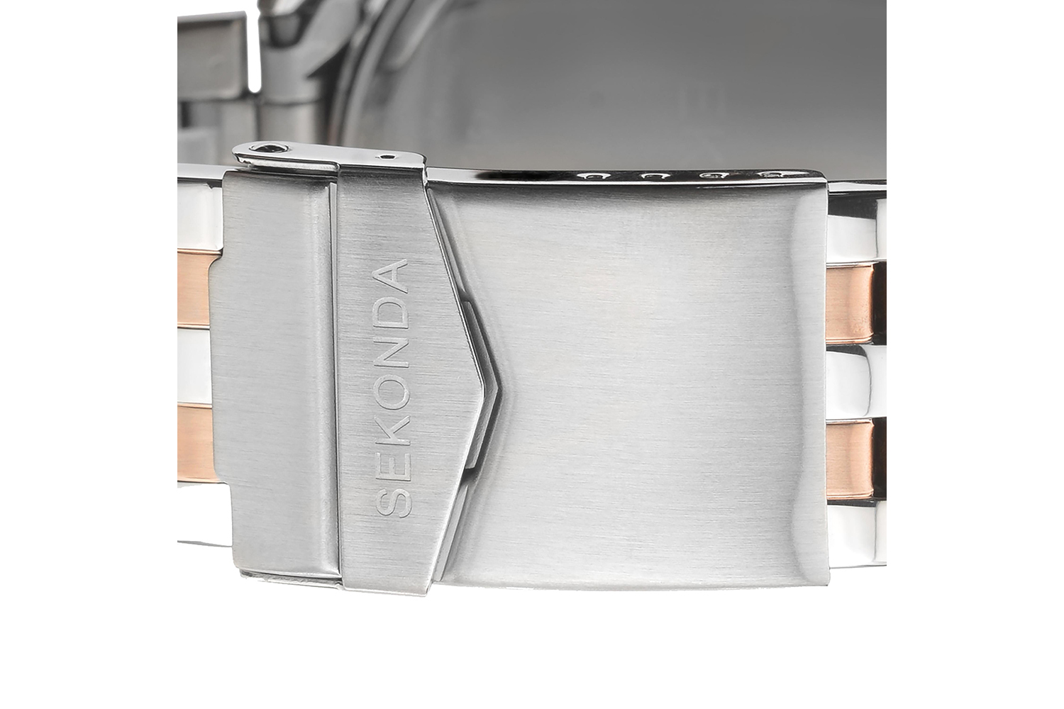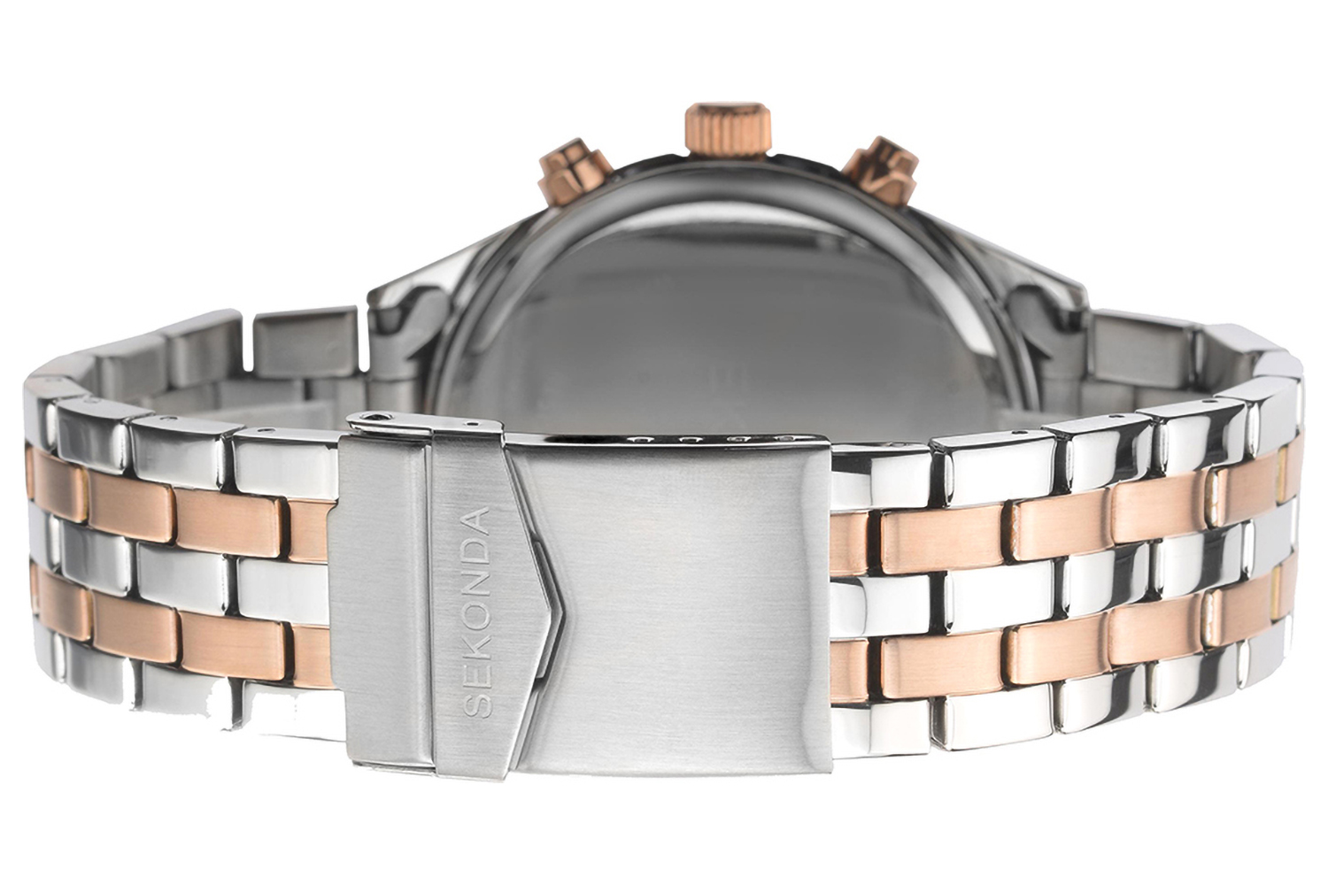 'All in good time' is a philosophy this fashionable Sekonda watch fulfils. Yes, it doesnt merely stop at helping you count time it is rightly your partner during all cues of life. Its 1/10th second Chronograph timing up to 1 hour lets you experience every kick of the second hand a celebration of moments one by one. The seamless collaboration of silver and rose gold on the stainless steel bracelet punctuates the urbane appearance and incorporates a double lock safety clasp guaranteeing secure fastening and a snug fit around your wrist.