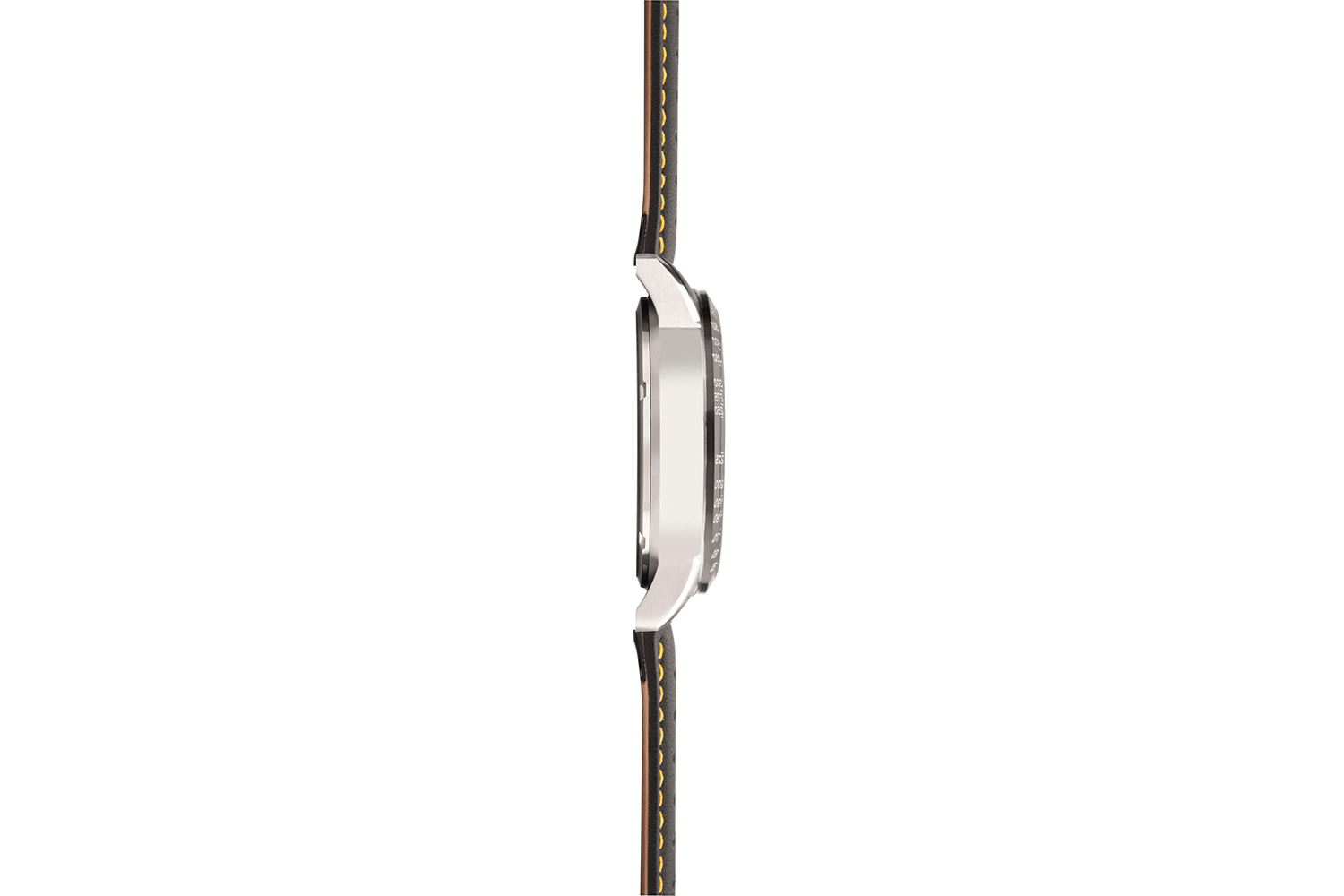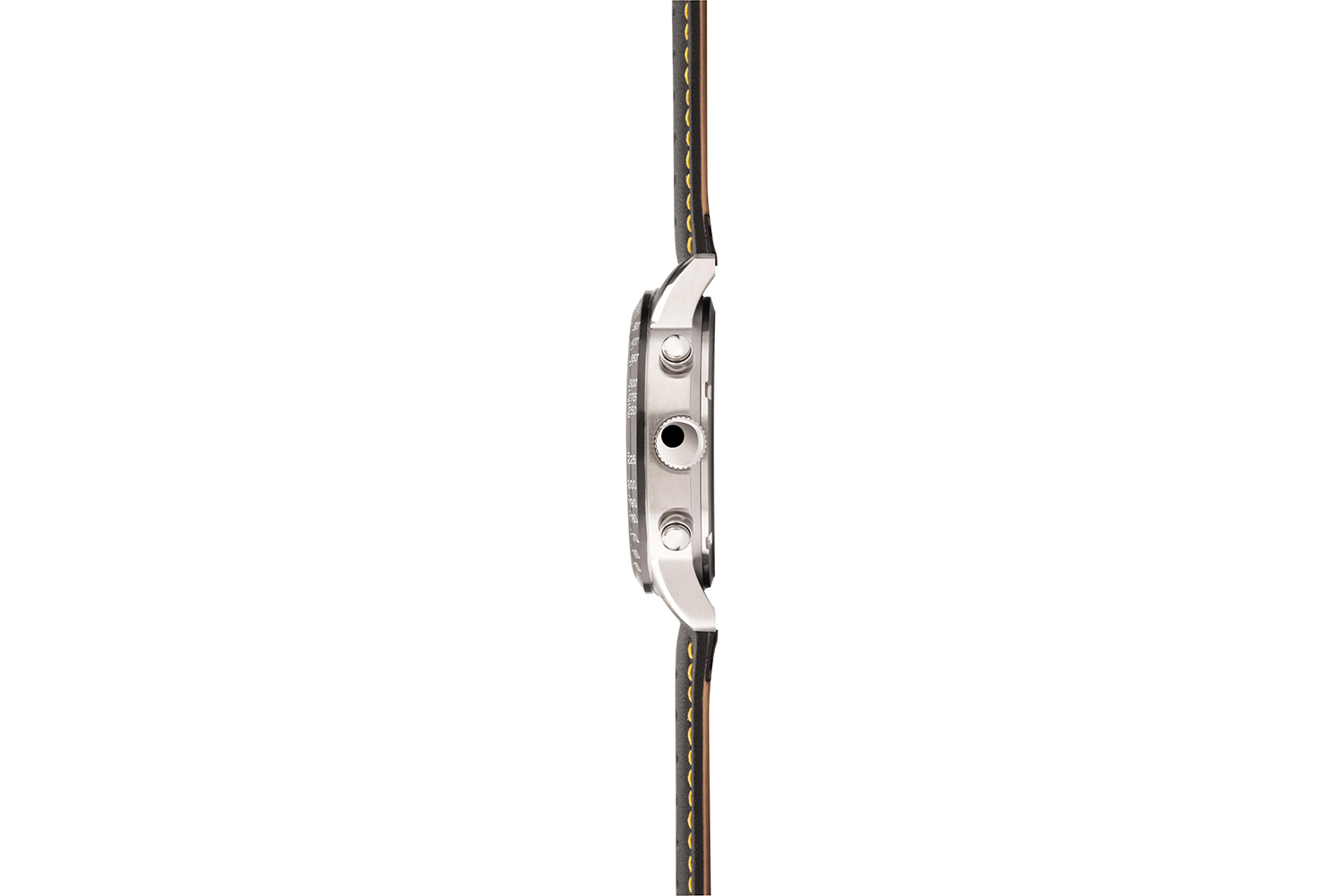 The black leather strap with standout yellow stitching secures the watch comfortably on your wrist, sporting an adaptable minimum strap length of 165mm to a maximum of 205mm. Water-resistant up to 50 metres, it ensures that your busy lifestyle is supported even during your various water-related activities, guaranteeing optimum functionality and durability.