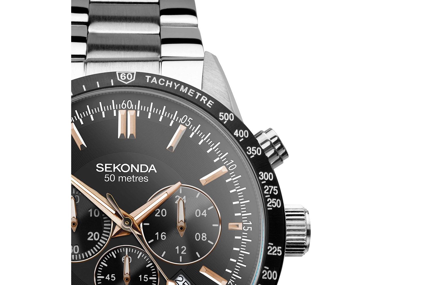 SEKONDA delivers a watch design that boasts the combined elegance of a stainless-steel case and bracelet, the intrigue of a black dial, and the excitement of practical features. Housed within the robust and gleaming stainless-steel case is a black bezel adorned with tachymeter markingsa tasteful detail that brings a modern edge. This accent harmonises effortlessly with the black dial, creating a timepiece that is sophisticated and intriguing.