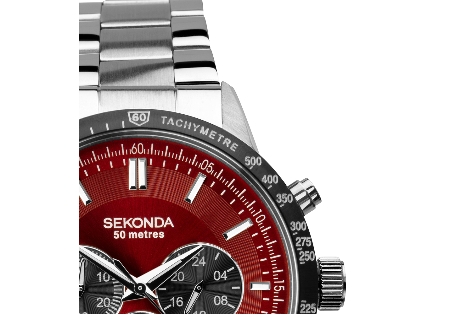 'Effortlessly combine fashion and functionality with the Sekonda Velocity Chronograph Men's Watch. Crafted by renowned brand Sekonda, this watch showcases a sleek silver stainless steel case and bracelet, beautifully contrasting with the unique red dial.