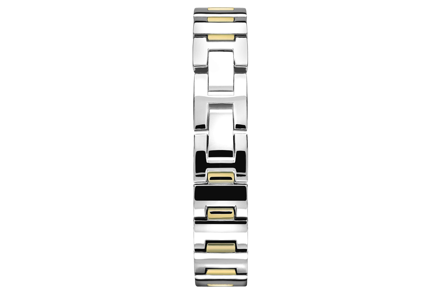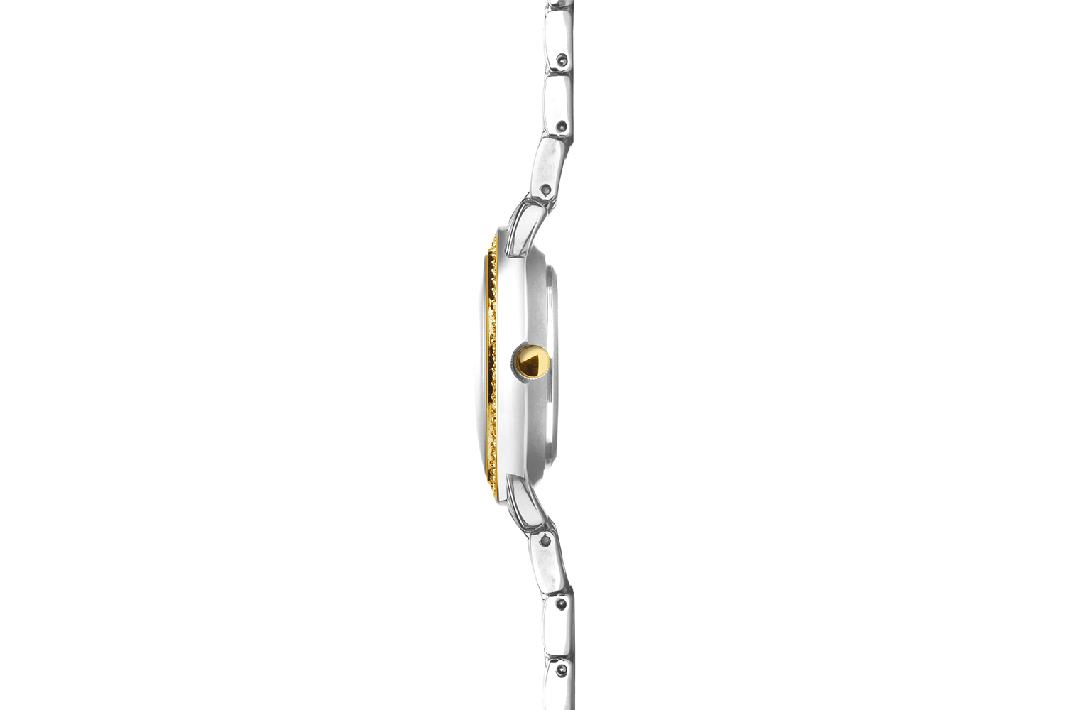 The champagne Mother-of-Pearl dial creates a truly captivating focal point, while the two-tone bracelet mirrors the design of the case, maintaining a harmonious balance. Fastened with an alloy bracelet touched with silver and gold ion plating, this ladies watch offers the perfect fusion of fashion and comfort.
