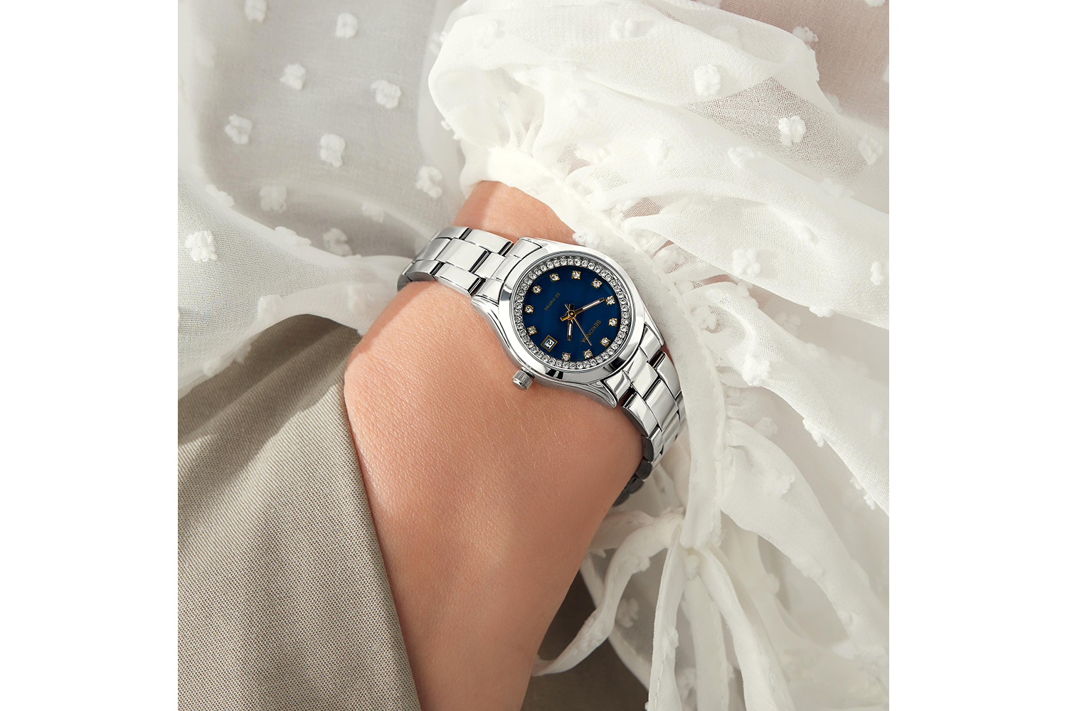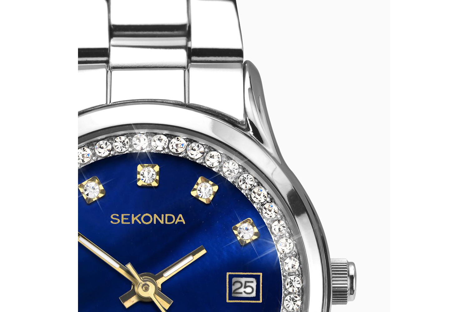 - Dark blue mother of pearl dial set with sparkling crystals and date display.