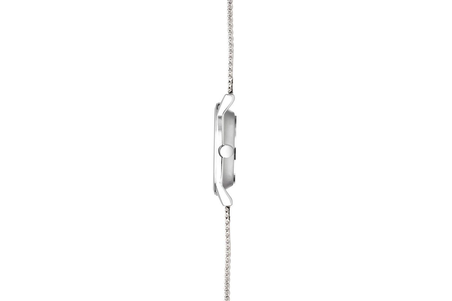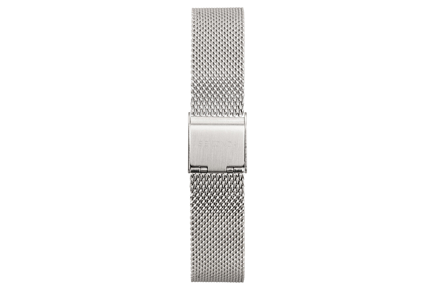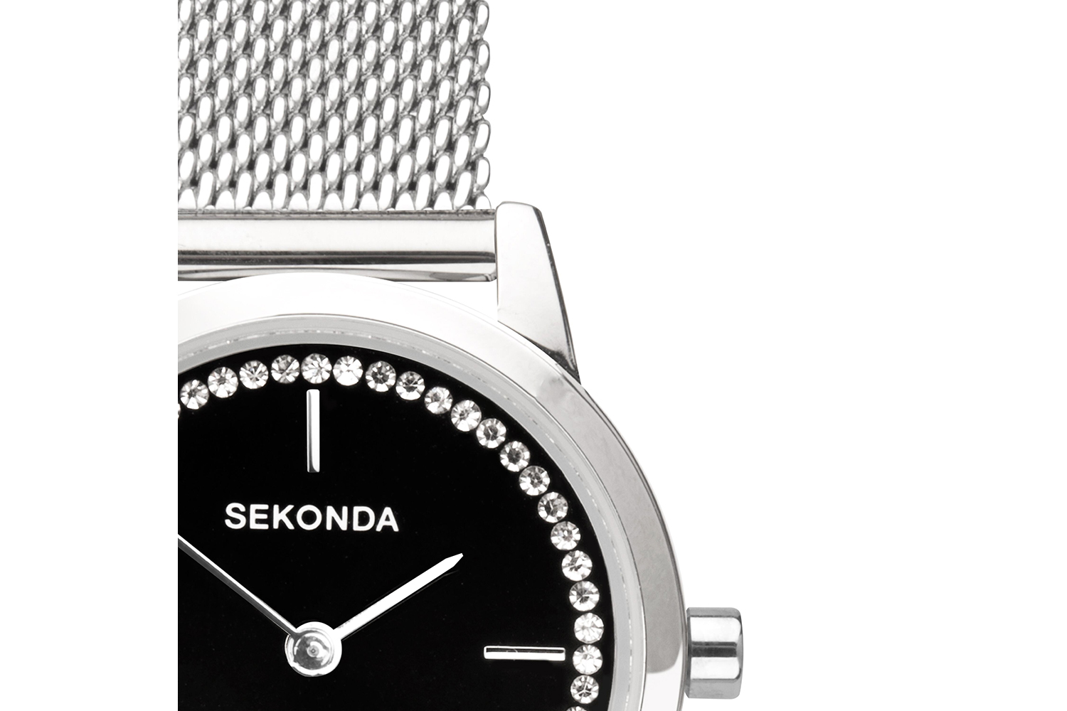 Residing within a stylish round, silver-coloured case is the striking, stone-set black sunray dial. The understated elegance of the black dial is paired with the edgy brilliance of the stone-set creating a harmonious blend of sophistication and glamour. Fastened by a silver, stainless steel mesh bracelet, the watch emanates both comfort and class.