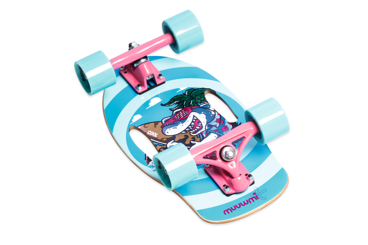 Shortboard made of high quality 7-ply maple wood Shark Design 43 x 22 cm deck, with functional carrying handles Non-slip grip tape with logo print 5.5 inch aluminium trucks, coloured 63 x 48 mm cast PU wheels, High rebound, 78A ABEC 7 ball bearings Maximum user weight 100 kg/220 lbs.