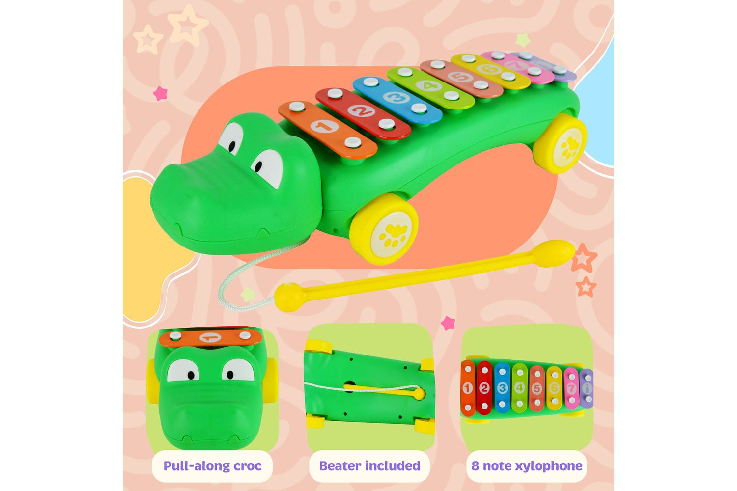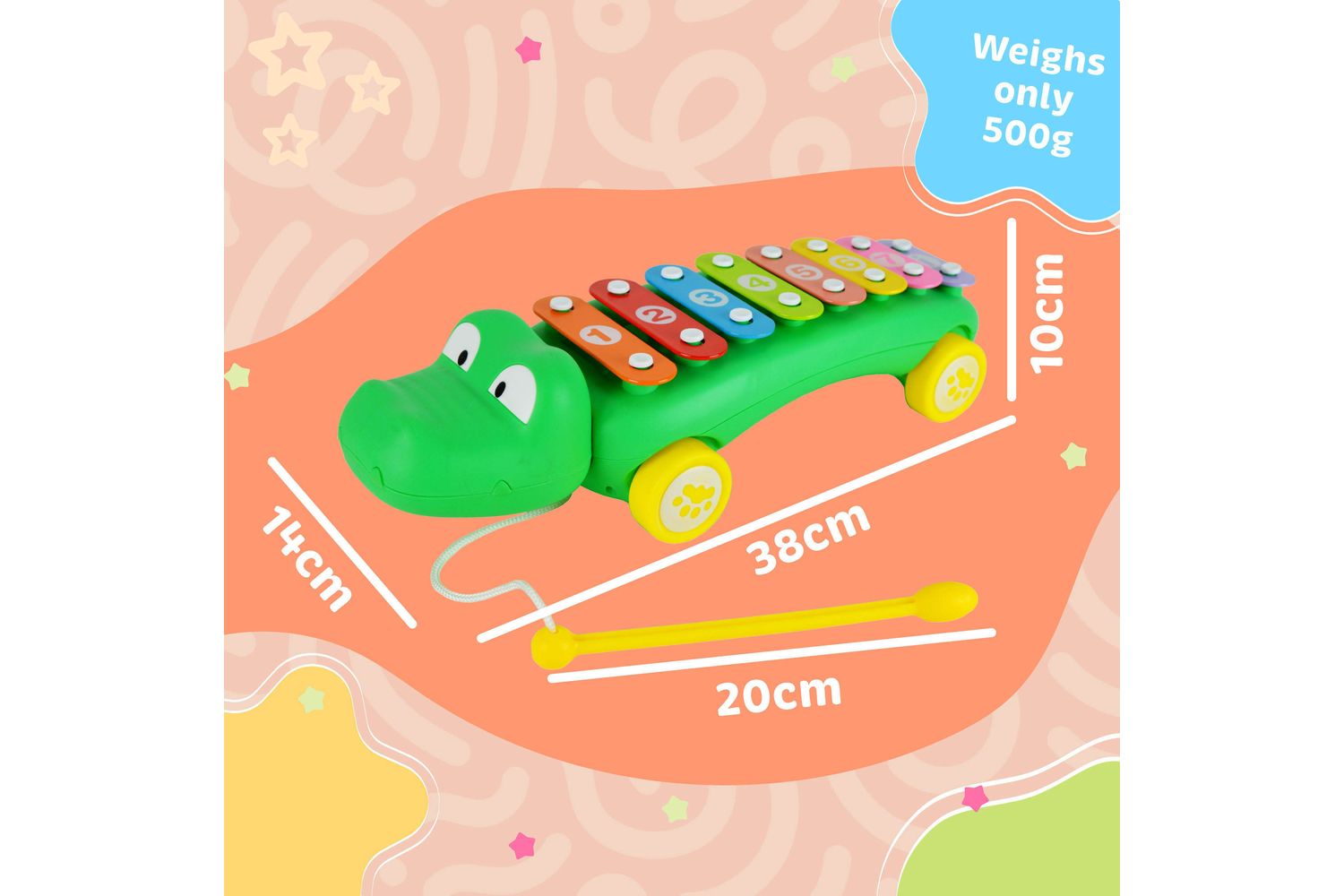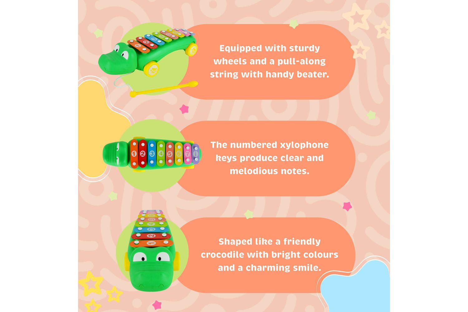 Infuse your child's imaginative play sessions with vibrant colours and interesting sounds through our endearing crocodile-shaped xylophone. Its high-quality and melodious metal keys produce clear notes that your little musician will enjoy creating and listening to. Children's playtime experiences are not only meant to entertain but also to foster creativity, motor skill development, and foster learning value—a mission splendidly served by our pull along xylophone!