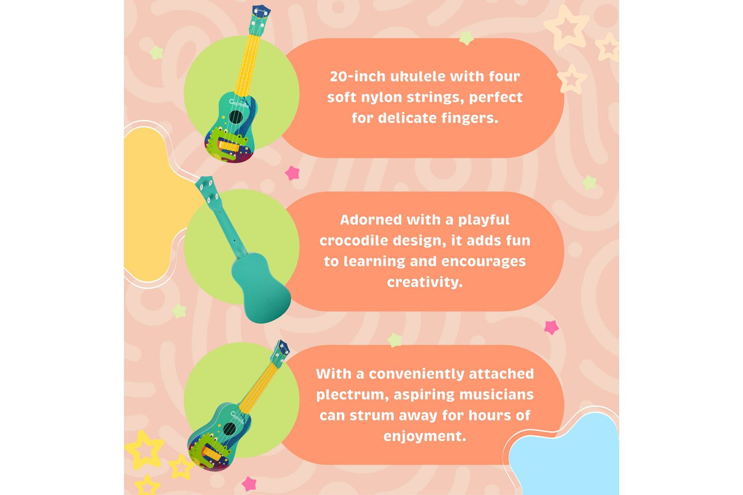 The Little Star Crocodile Ukulele is indeed more than a musical toy—it's a vibrant doorway into a child's endless creativity, where they can explore sound, rhythm and melody on their terms. Let your child discover their unique beat in the comfort of their playtime!