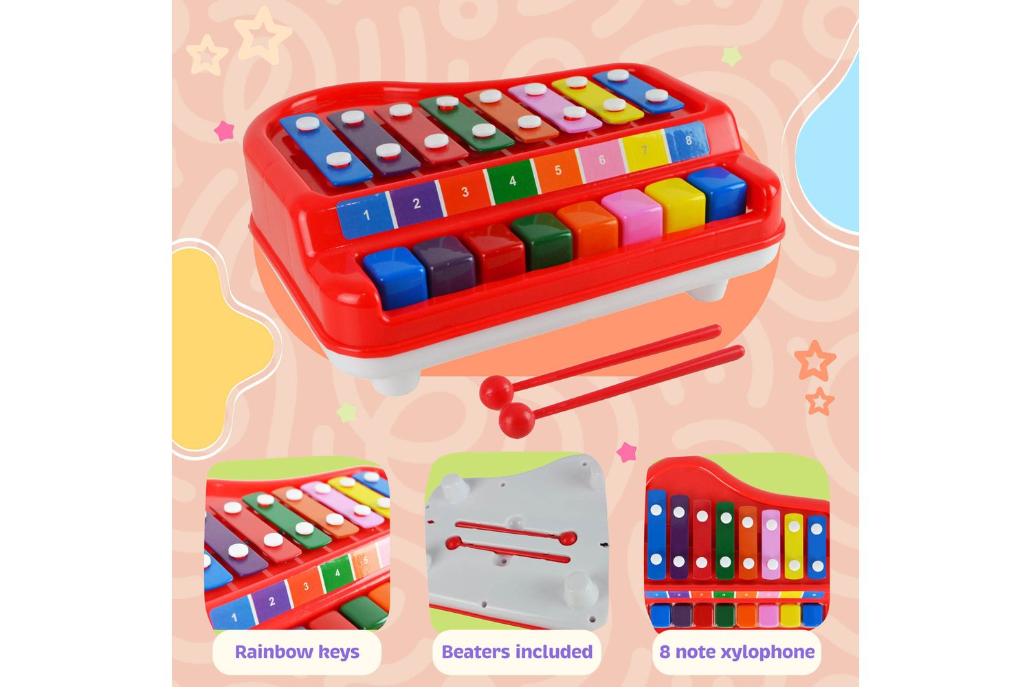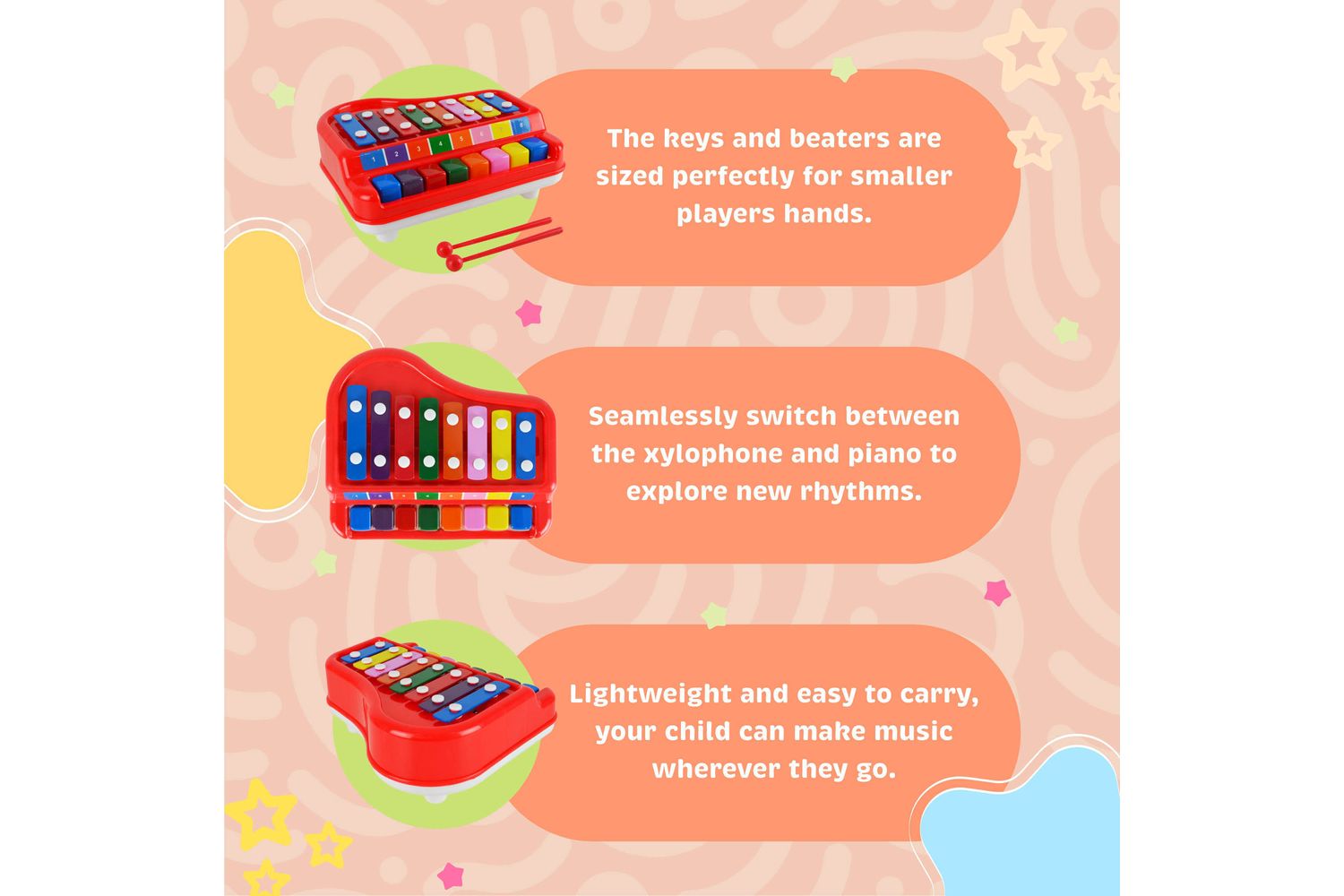 Expertly merging the colorful lyrical chimes of a xylophone with the varied keys of a grand piano, our 2-in-1 toy paves a clear path of musical innovation for your little mercury. Seamlessly switch between the xylophone and piano settings to experience an extensive assortment of musical notes and rhythmic possibilities.