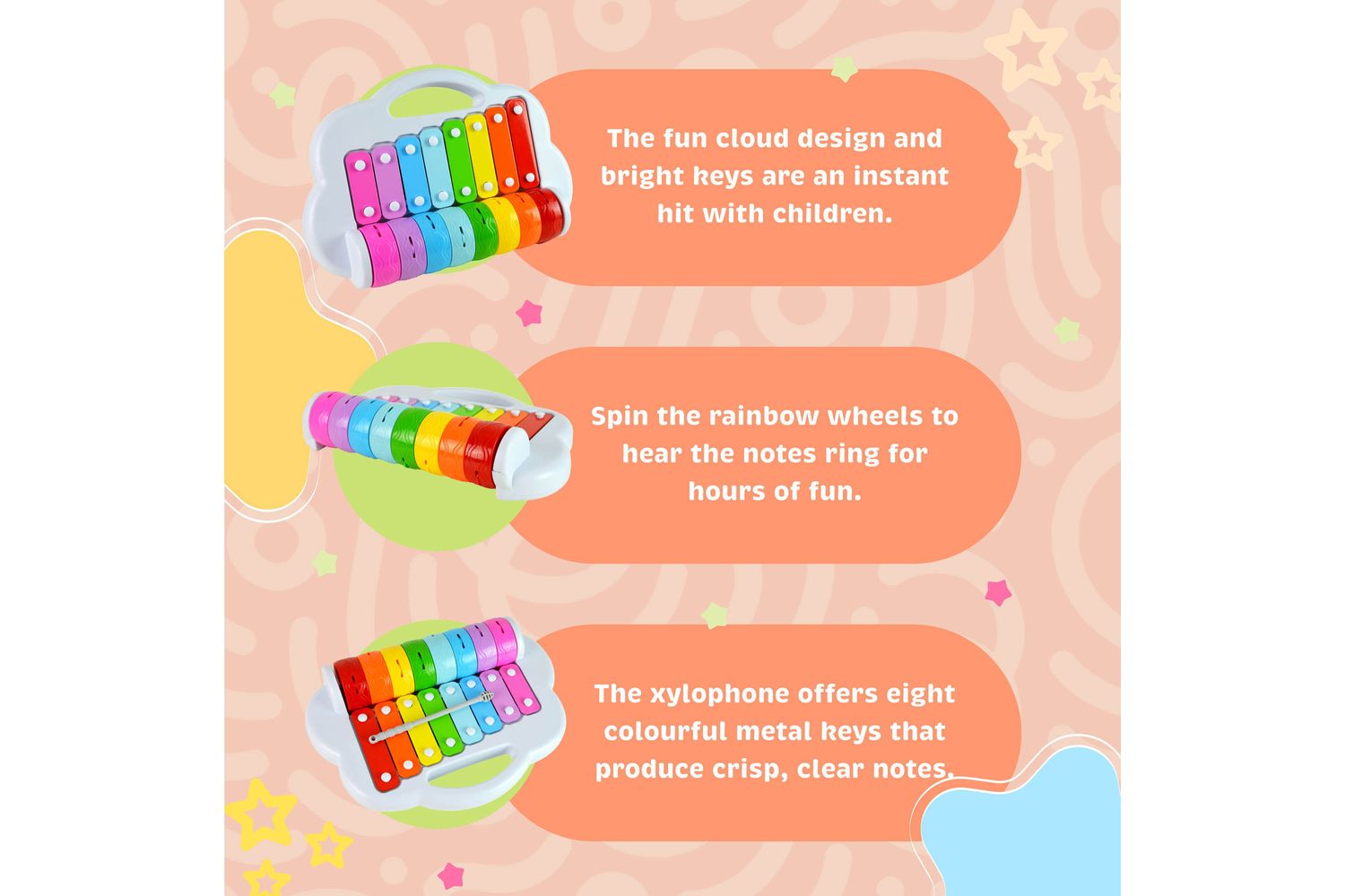 Made with robust and child-safe material, our xylophone is crafted to endure spirited play, reassuring you with its durability. Notching up on the appeal, this xylophone comes with rolling spinners. They can experiment with music and explore different sounds by spinning the colourful wheels, or strike the metal keys and orchestrate their sweet melodies.