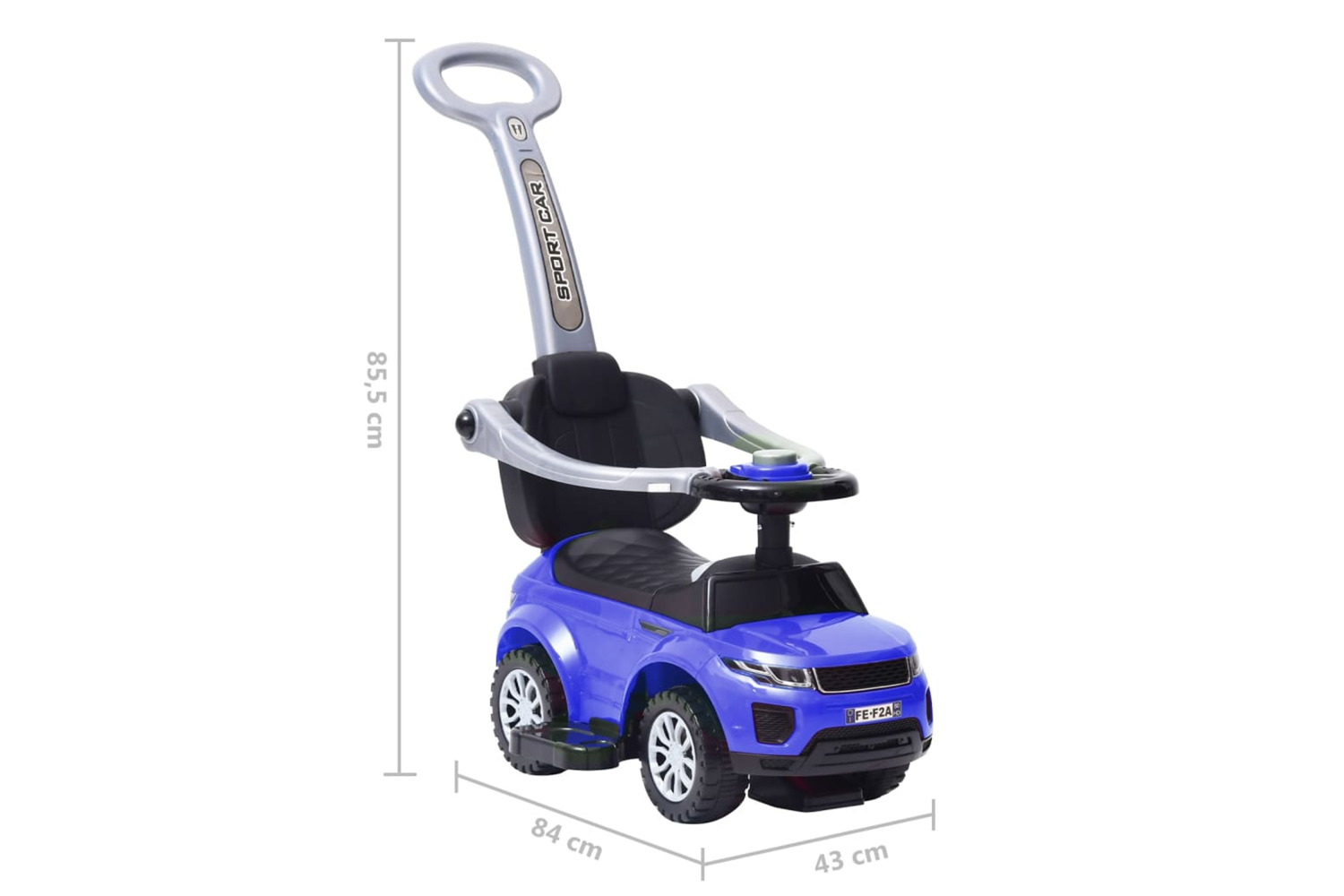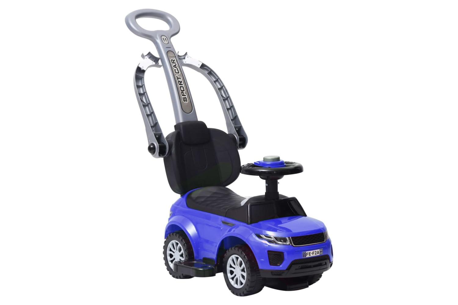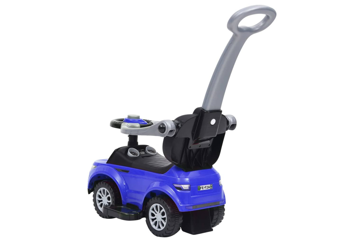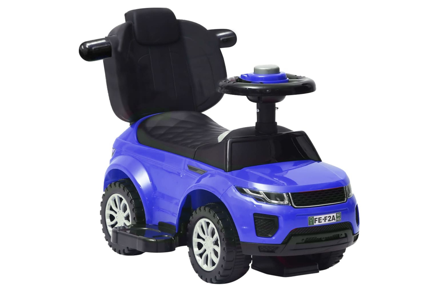 The stable base with four wheels allows kids to get on and off easily by themselves. Additionally, the protective bars and the push bar can be removed, depending on the size of the child. The safety steering wheel equipped with a horn is ideal for the first attempts of the little ones.