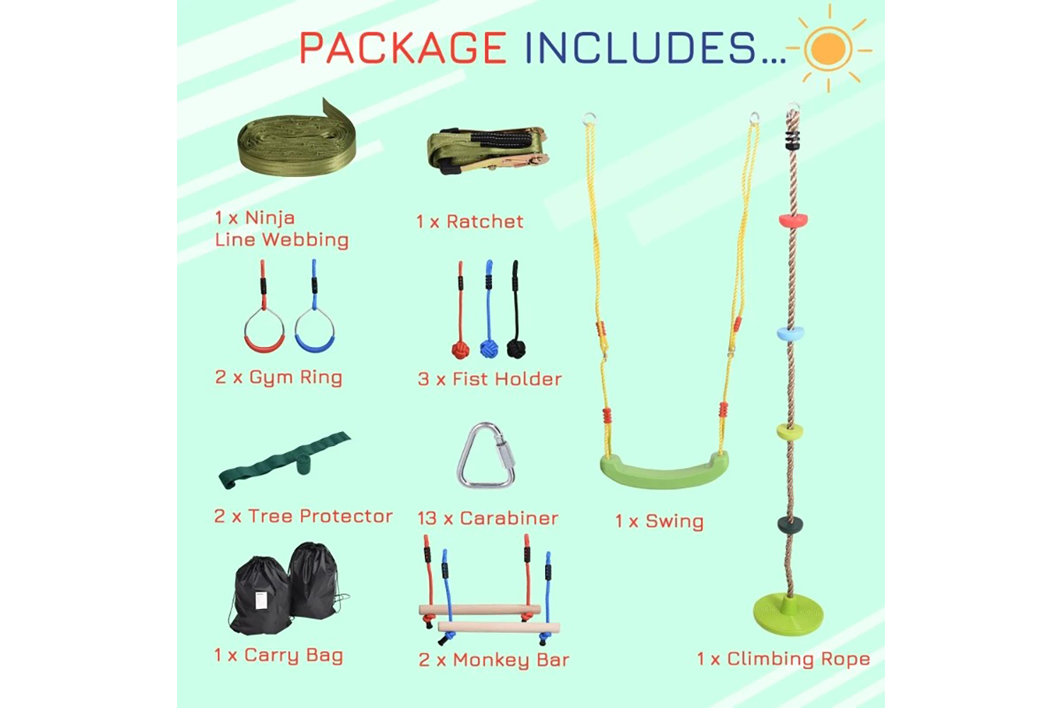 Are you still worried about your kid's addiction to TV and computers? Outsunny ninja warrior obstacle course help you solve the trouble and let your baby into the outdoors. Quality material and complete accessories ensures children safety when playing. Equips with monkey bars, gymnastic rings, climbing rope, fist holder and swing, your kid can play with their friend together. Suitable for children aged 5-12. Hang them in your home or yard to add fun to childhood. And brings fun experience for all day.