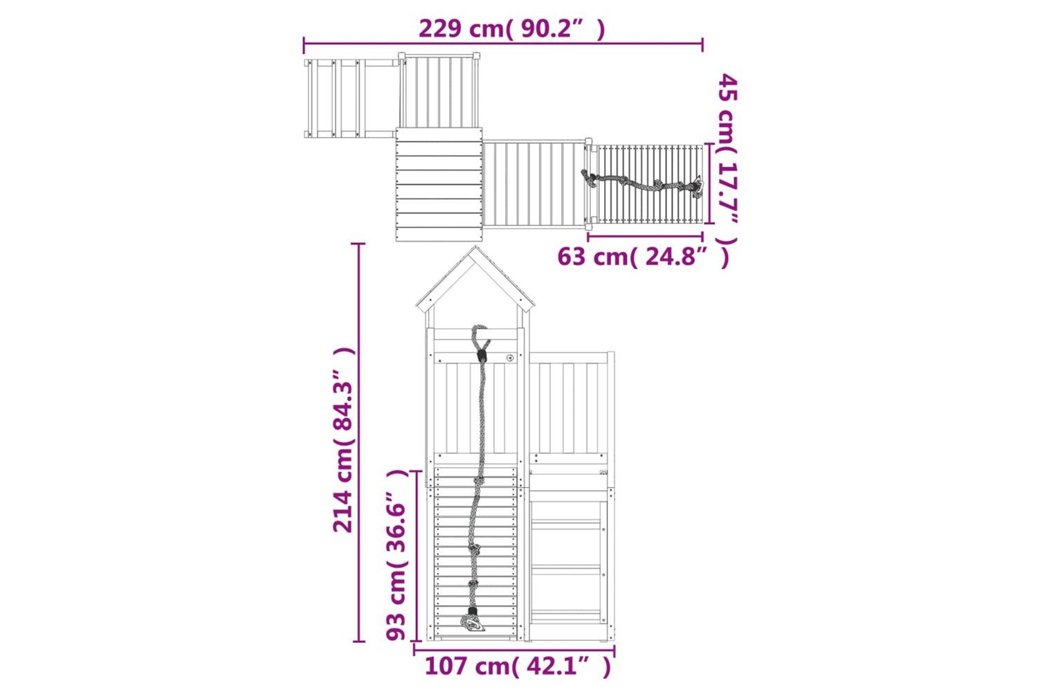 - Play tower dimensions: 166 x 107 x 214 cm (L x W x H)