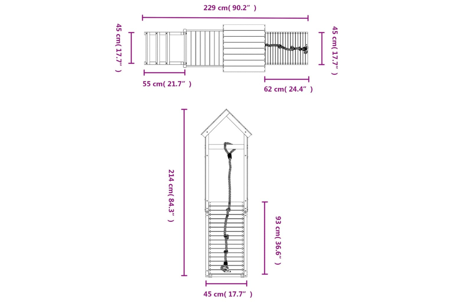 - Play tower dimensions: 110 x 64 x 214 cm (L x W x H)