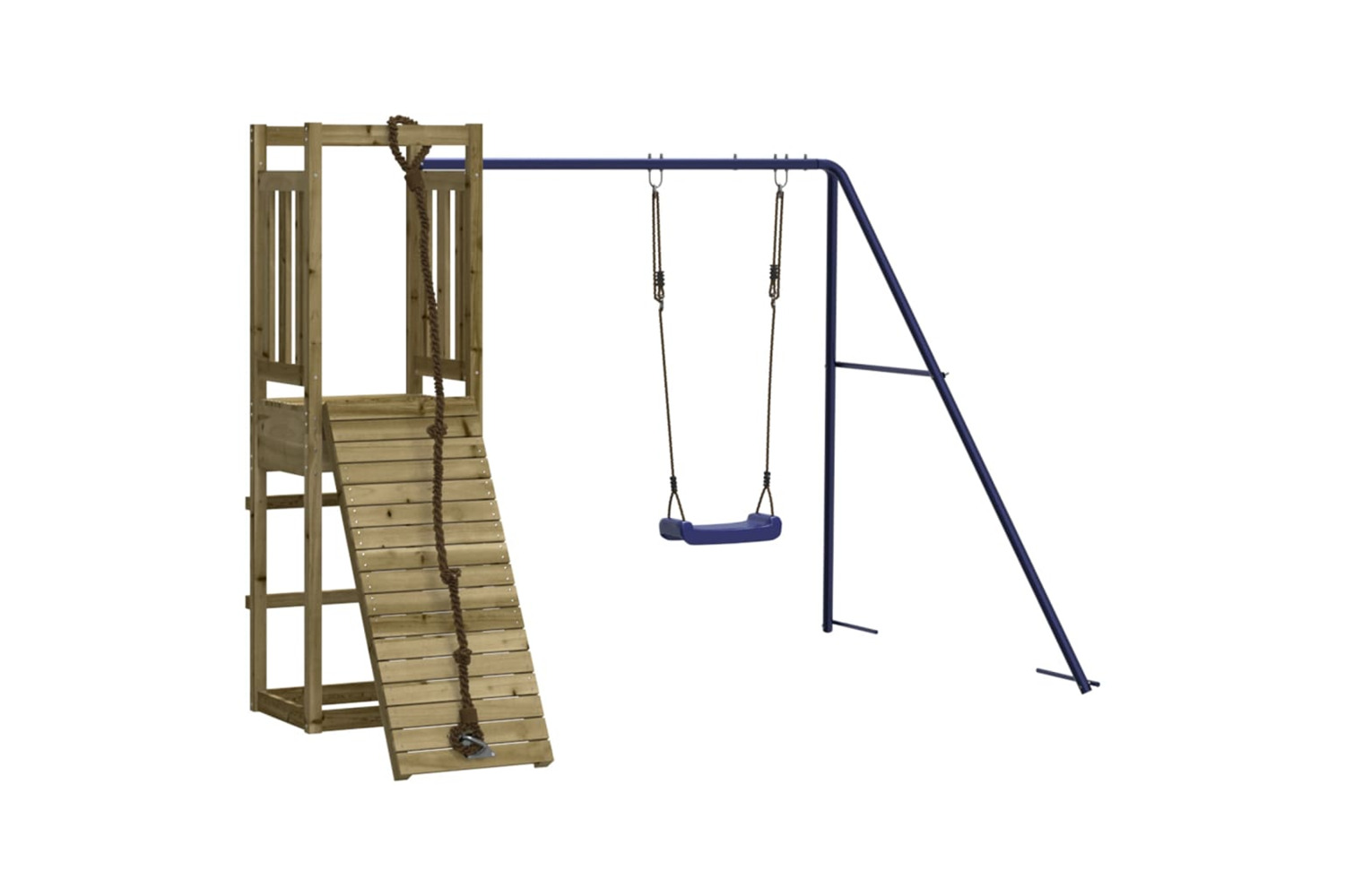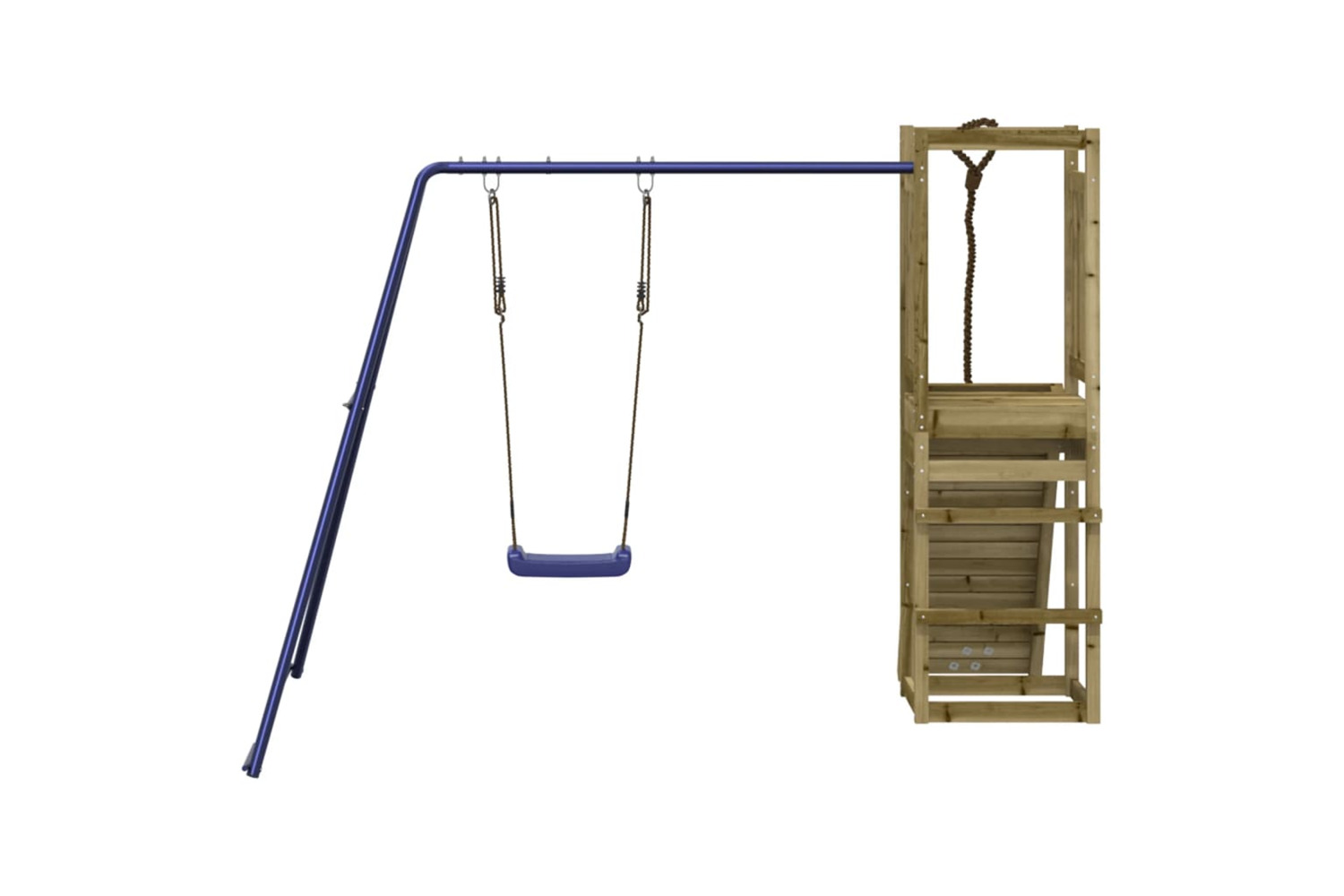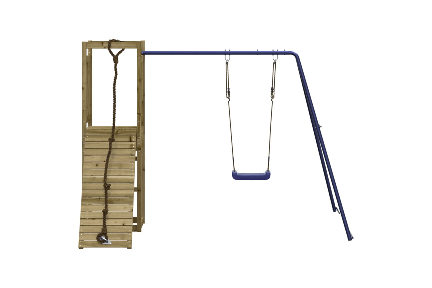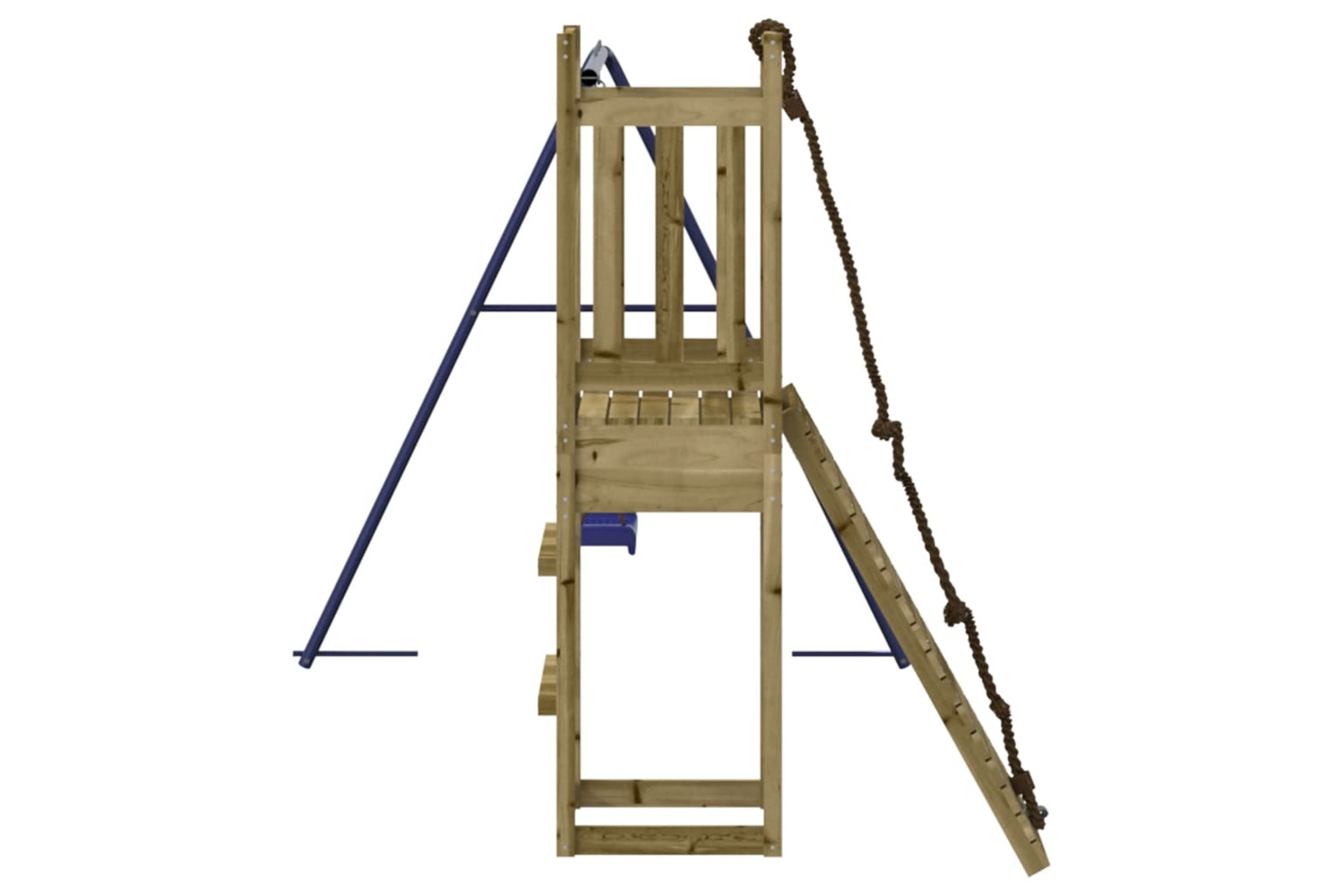 - Impregnated wood: This garden climbing frame is made of vacuum pressure impregnated pinewood. Solid pine wood is a beautiful natural material. Pine wood has a straight grain, and the knots give the material its signature, rustic look. Impregnation is a preservation process that is carried out by using autoclaves. The pressure-treatment increases resistance to decay and weather.