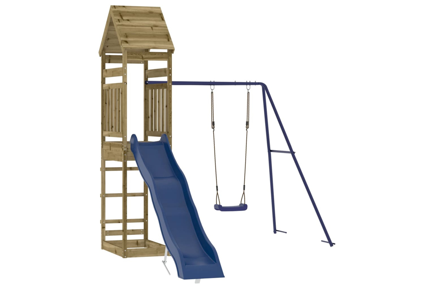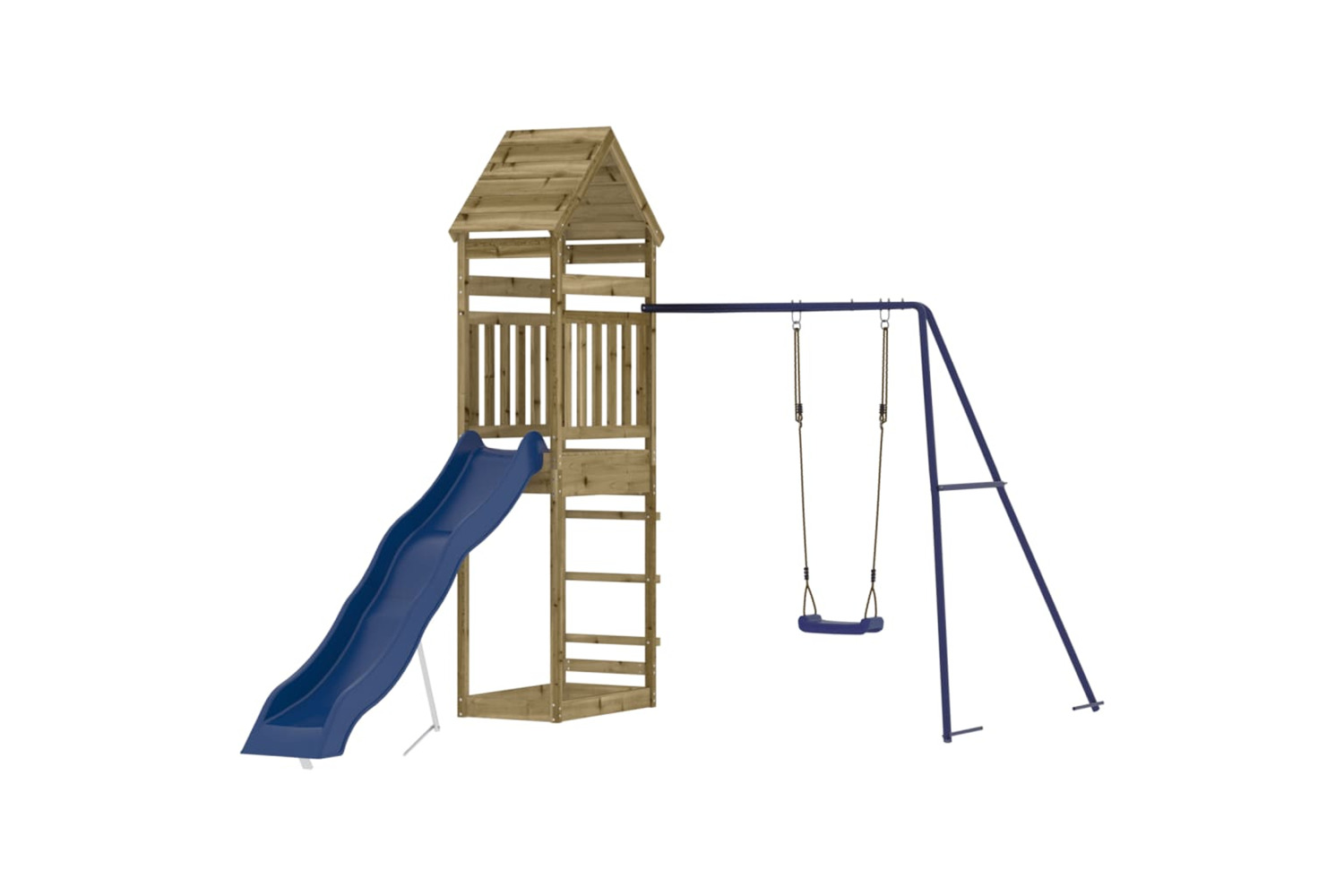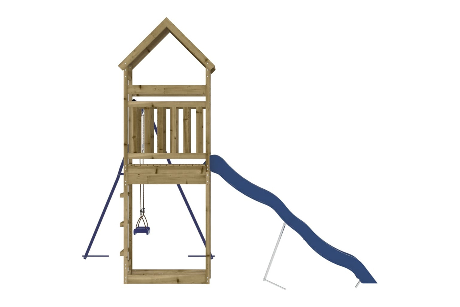 - Impregnated wood: This garden climbing frame is made of vacuum pressure impregnated pinewood. Solid pine wood is a beautiful natural material. Pine wood has a straight grain, and the knots give the material its signature, rustic look. Impregnation is a preservation process that is carried out by using autoclaves. The pressure-treatment increases resistance to decay and weather.