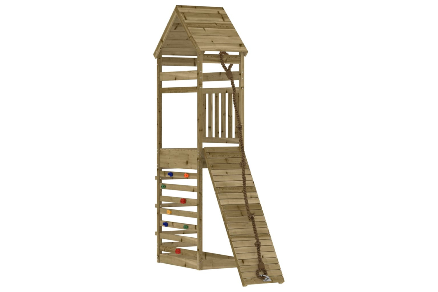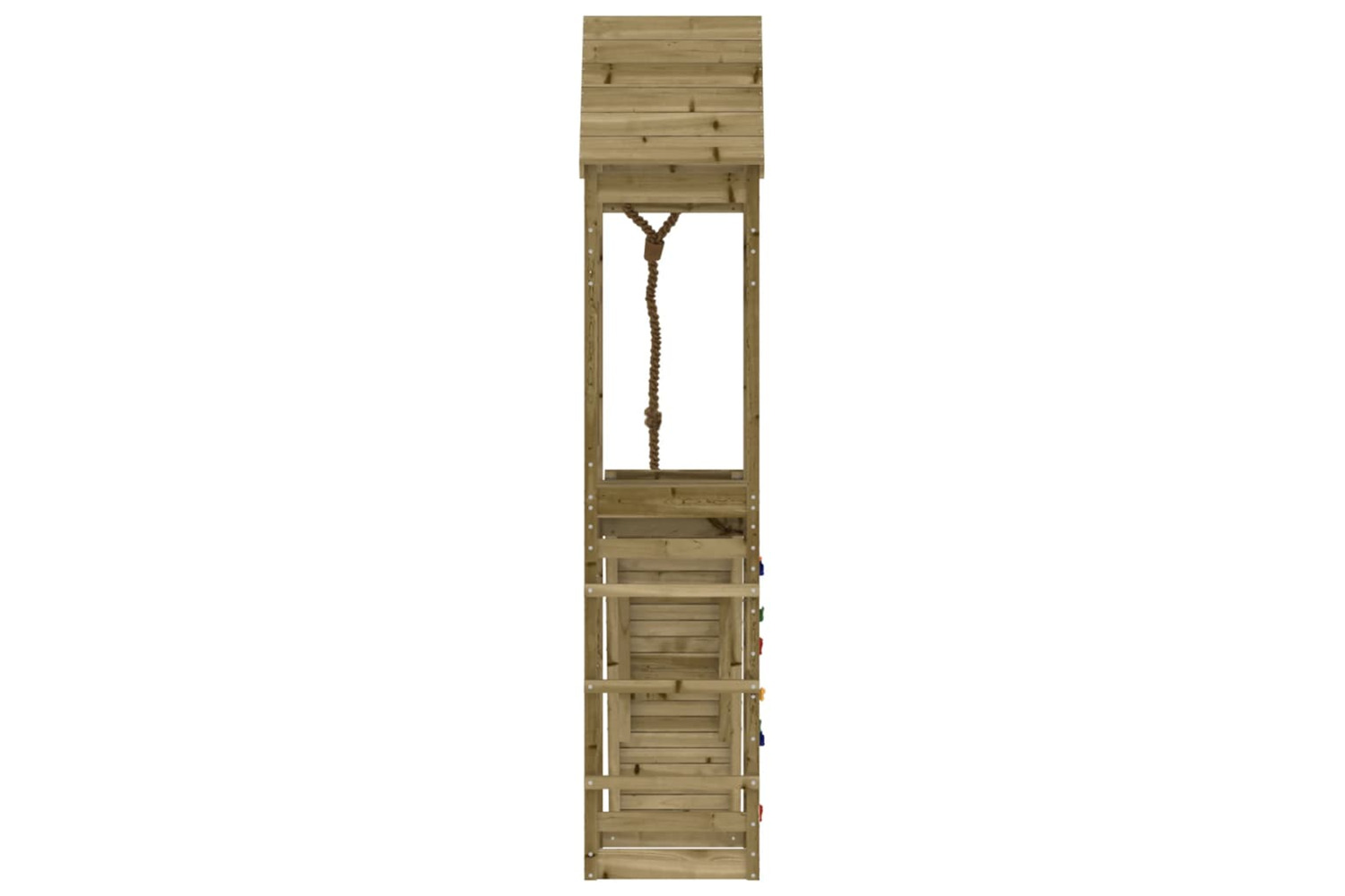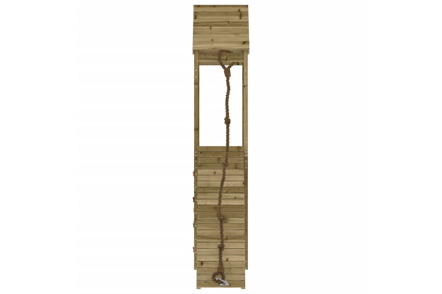 - Impregnated wood: This garden climbing frame is made of vacuum pressure impregnated pinewood. Solid pine wood is a beautiful natural material. Pine wood has a straight grain, and the knots give the material its signature, rustic look. Impregnation is a preservation process that is carried out by using autoclaves. The pressure-treatment increases resistance to decay and weather.