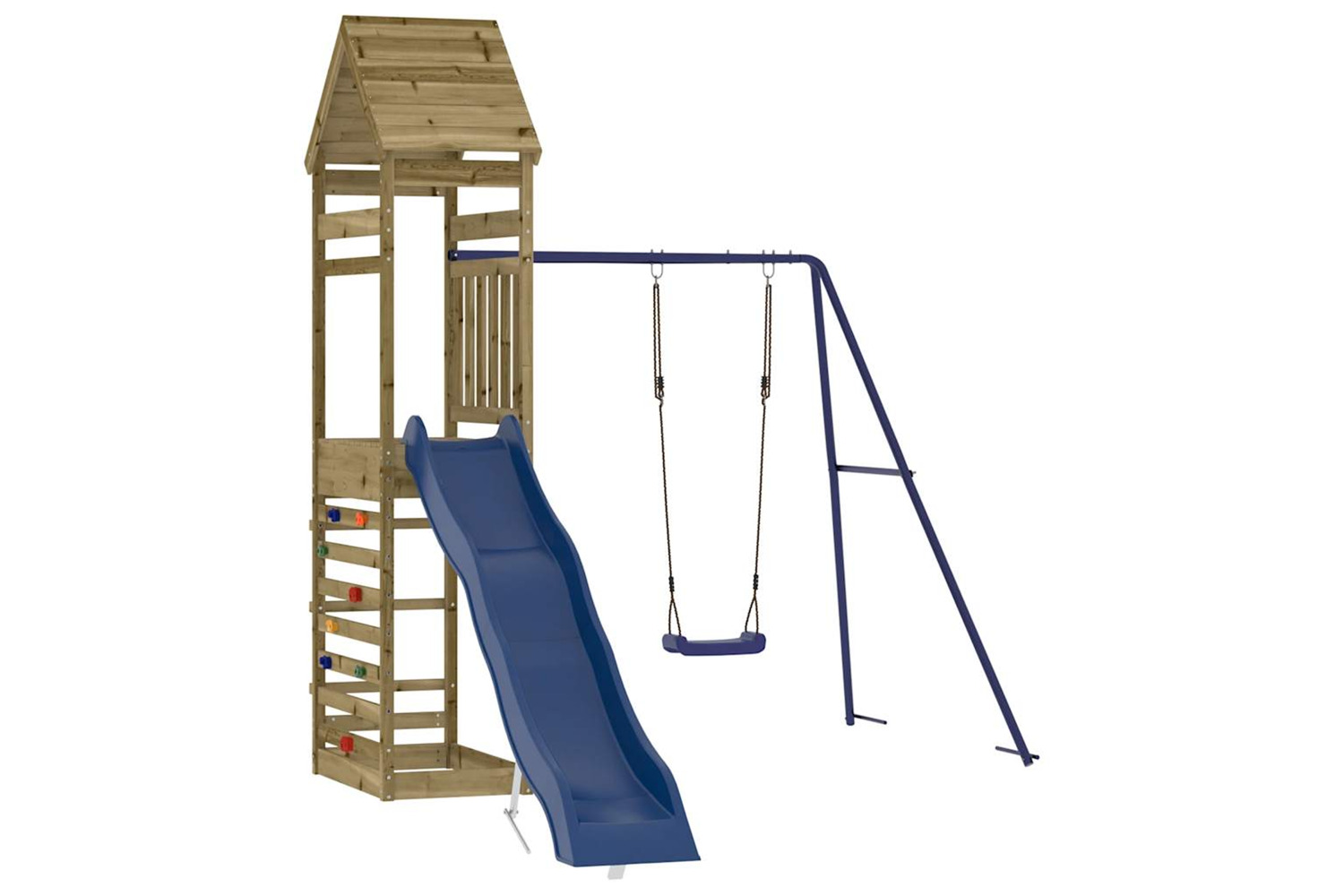 - Impregnated wood: This garden climbing frame is made of vacuum pressure impregnated pinewood. Solid pine wood is a beautiful natural material. Pine wood has a straight grain, and the knots give the material its signature, rustic look. Impregnation is a preservation process that is carried out by using autoclaves. The pressure-treatment increases resistance to decay and weather.