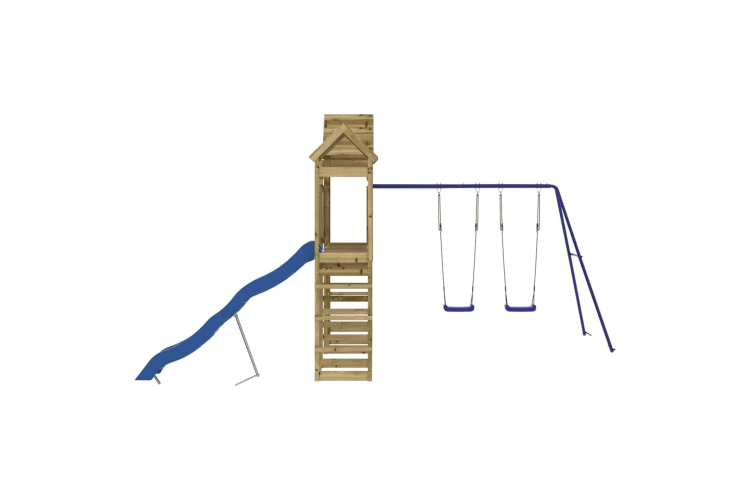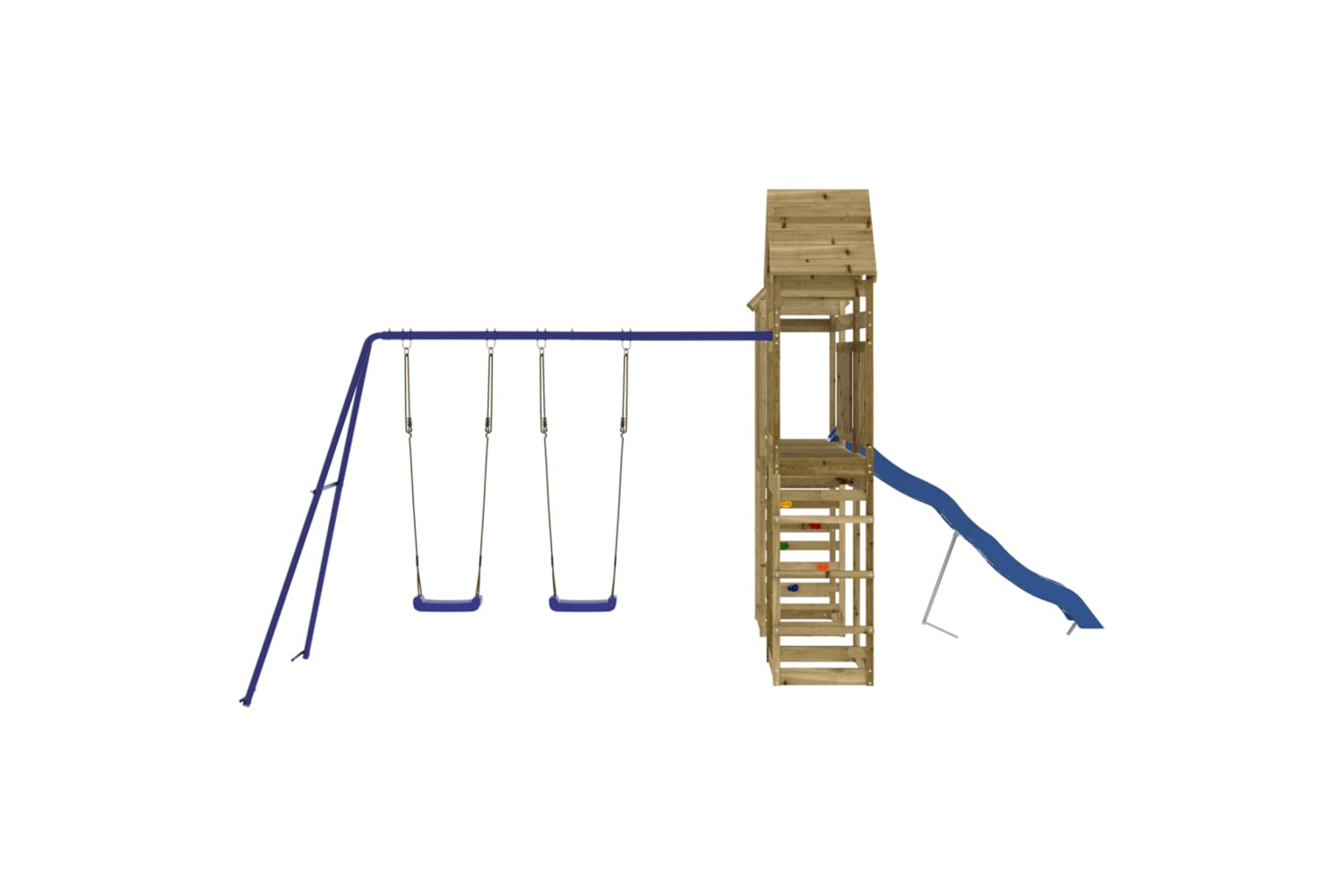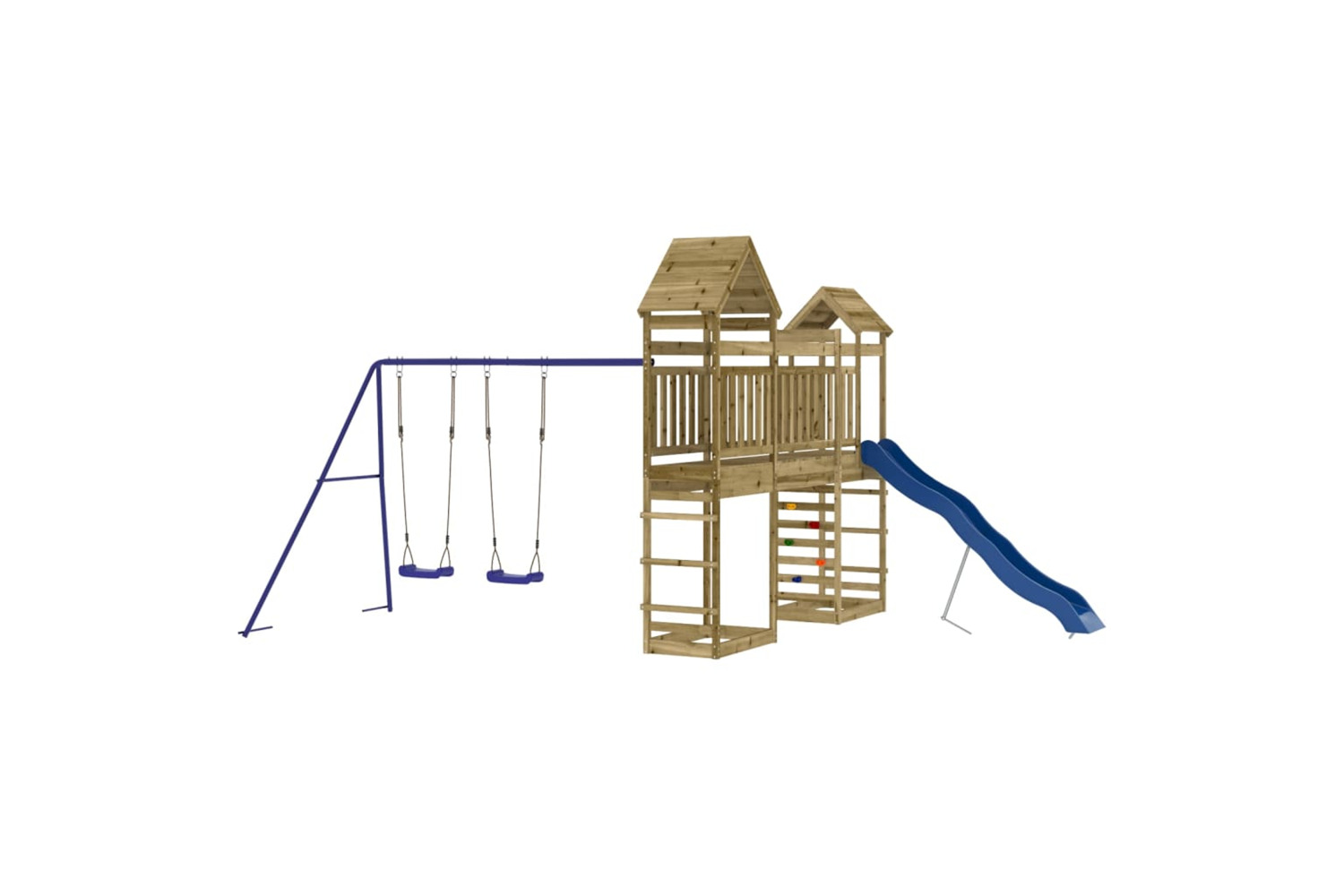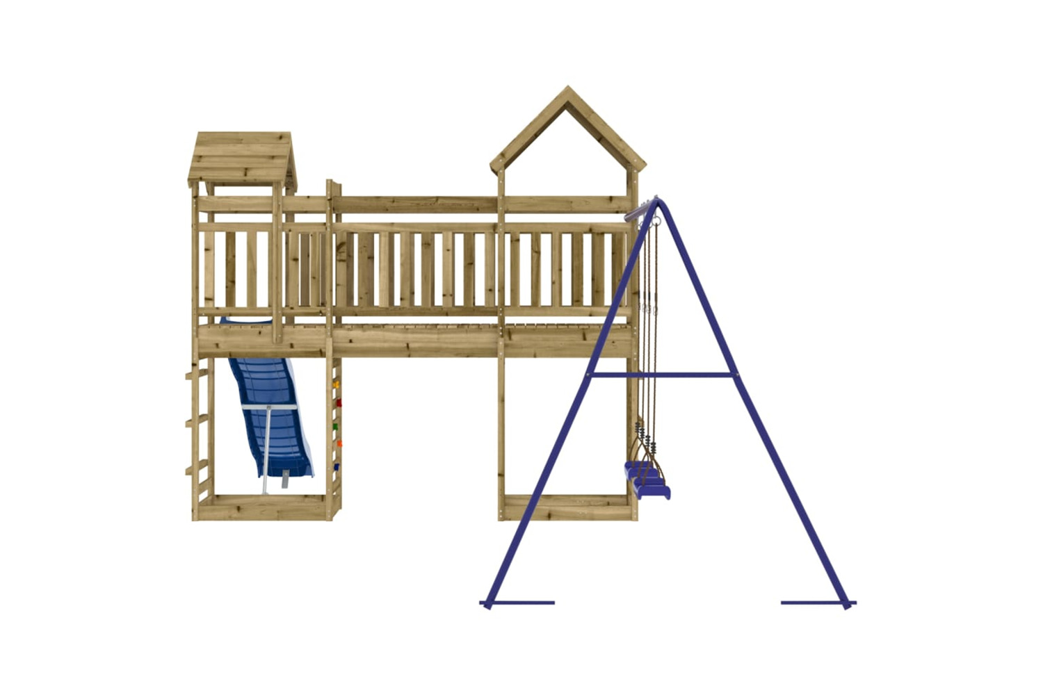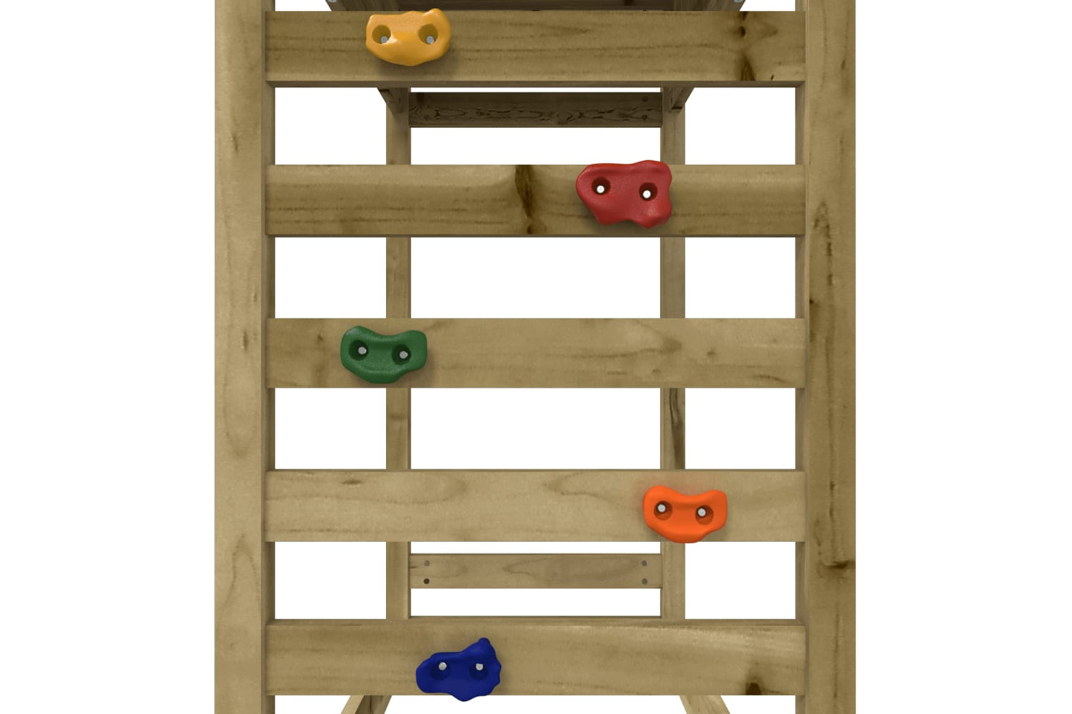 - Impregnated wood: This garden climbing frame is made of vacuum pressure impregnated pinewood. Solid pine wood is a beautiful natural material. Pine wood has a straight grain, and the knots give the material its signature, rustic look. Impregnation is a preservation process that is carried out by using autoclaves. The pressure-treatment increases resistance to decay and weather.