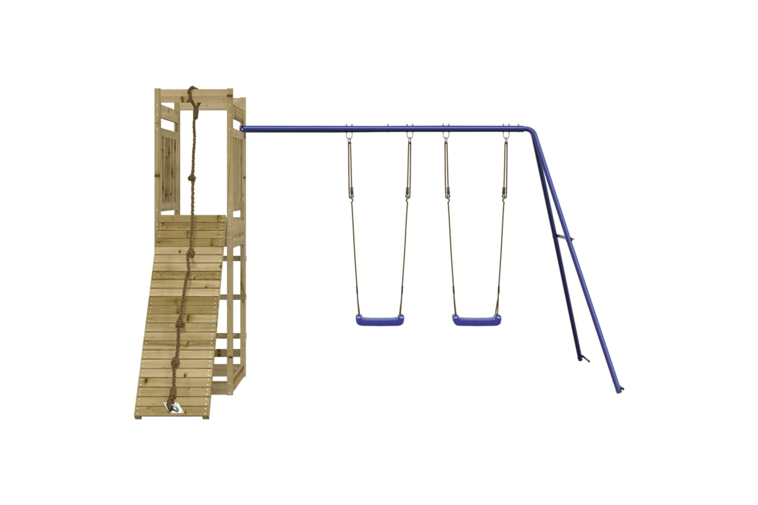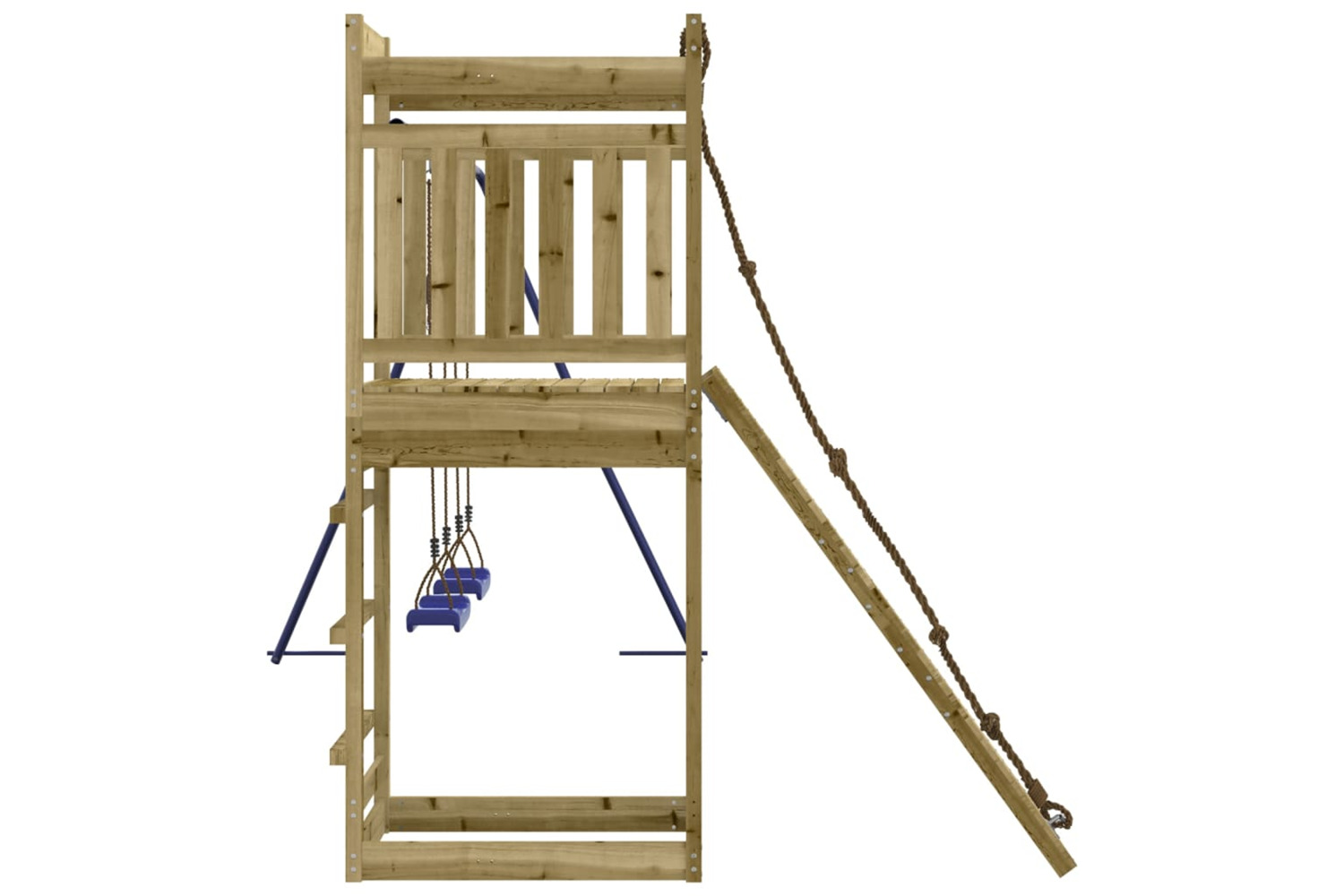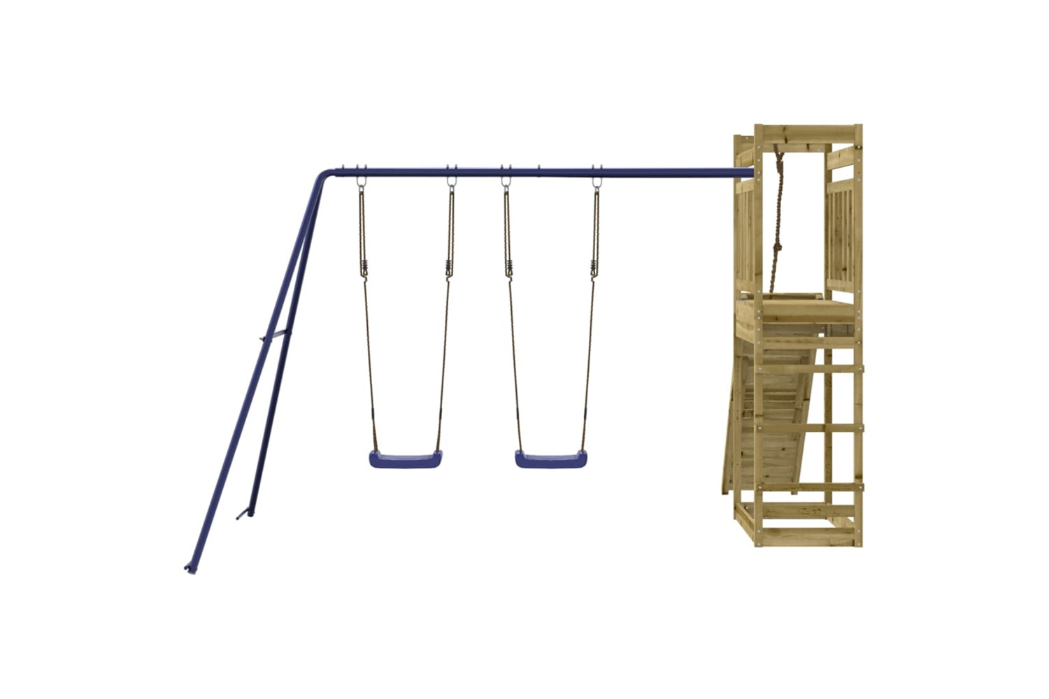 - Durable material: This playset is made of vacuum pressure impregnated pinewood. Solid pine wood is a beautiful natural material. Pine wood has a straight grain, and the knots give the material its signature, rustic look. Impregnation is a preservation process that is carried out by using autoclaves. The pressure-treatment increases resistance to decay and weather.