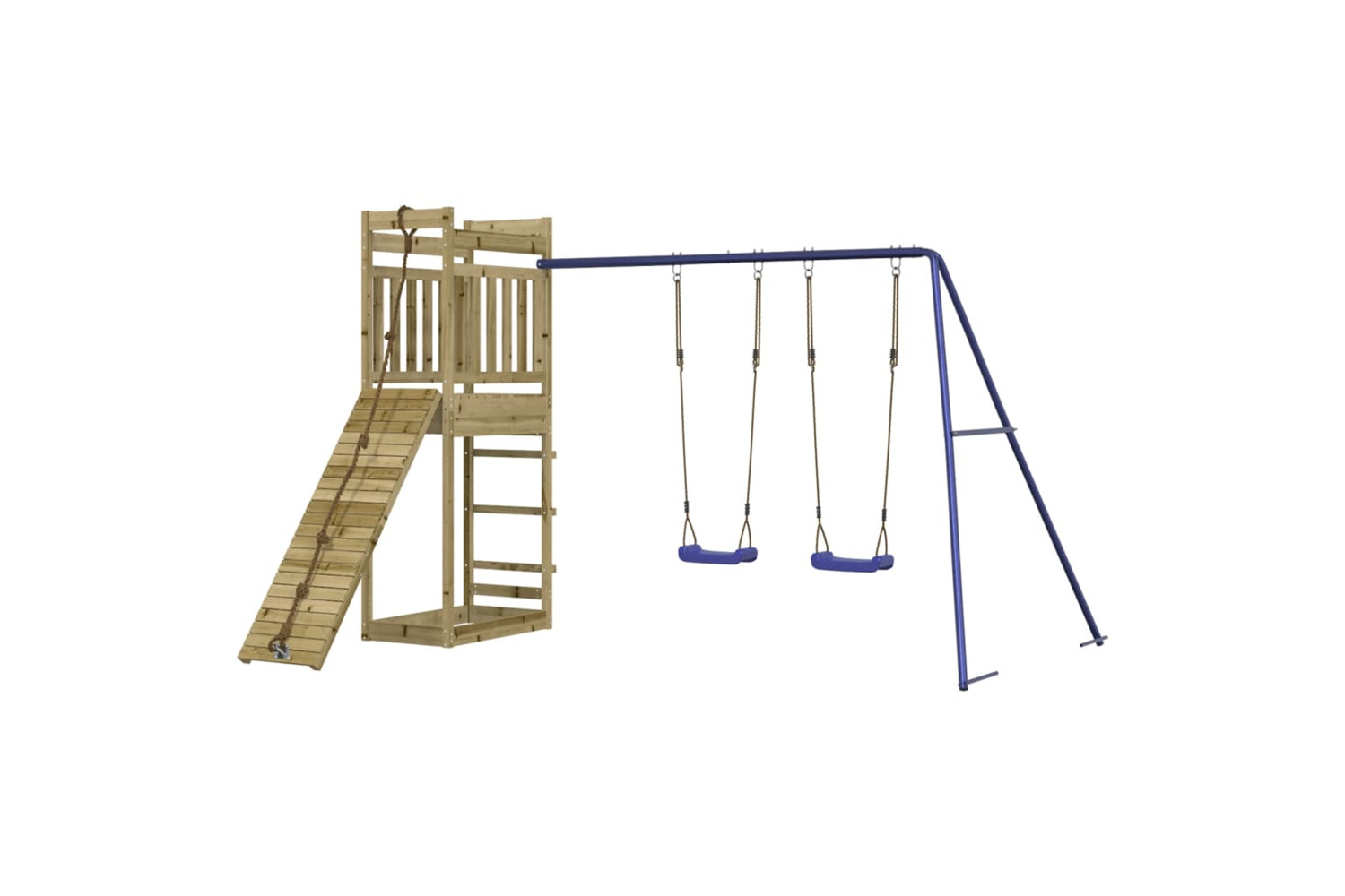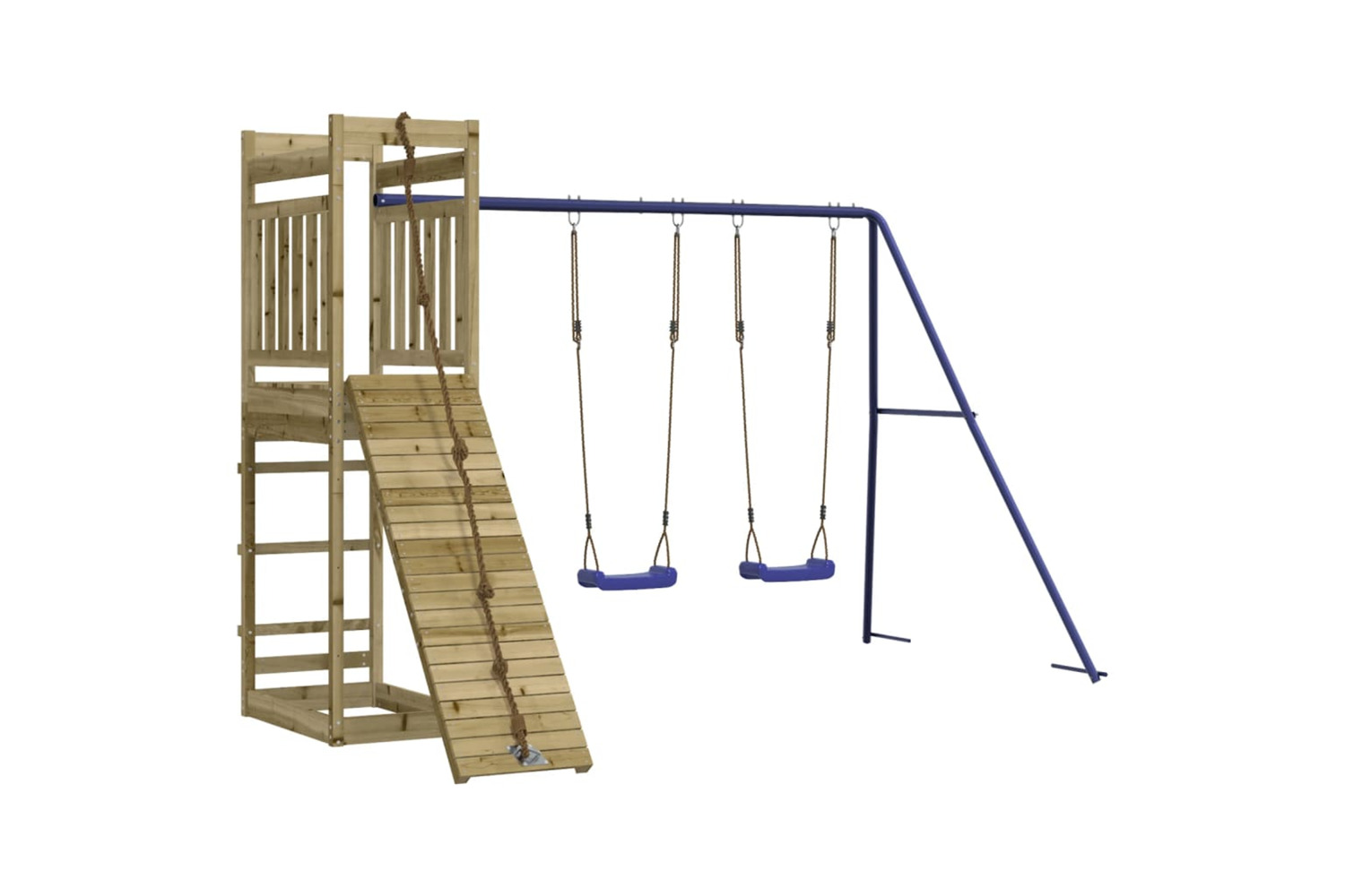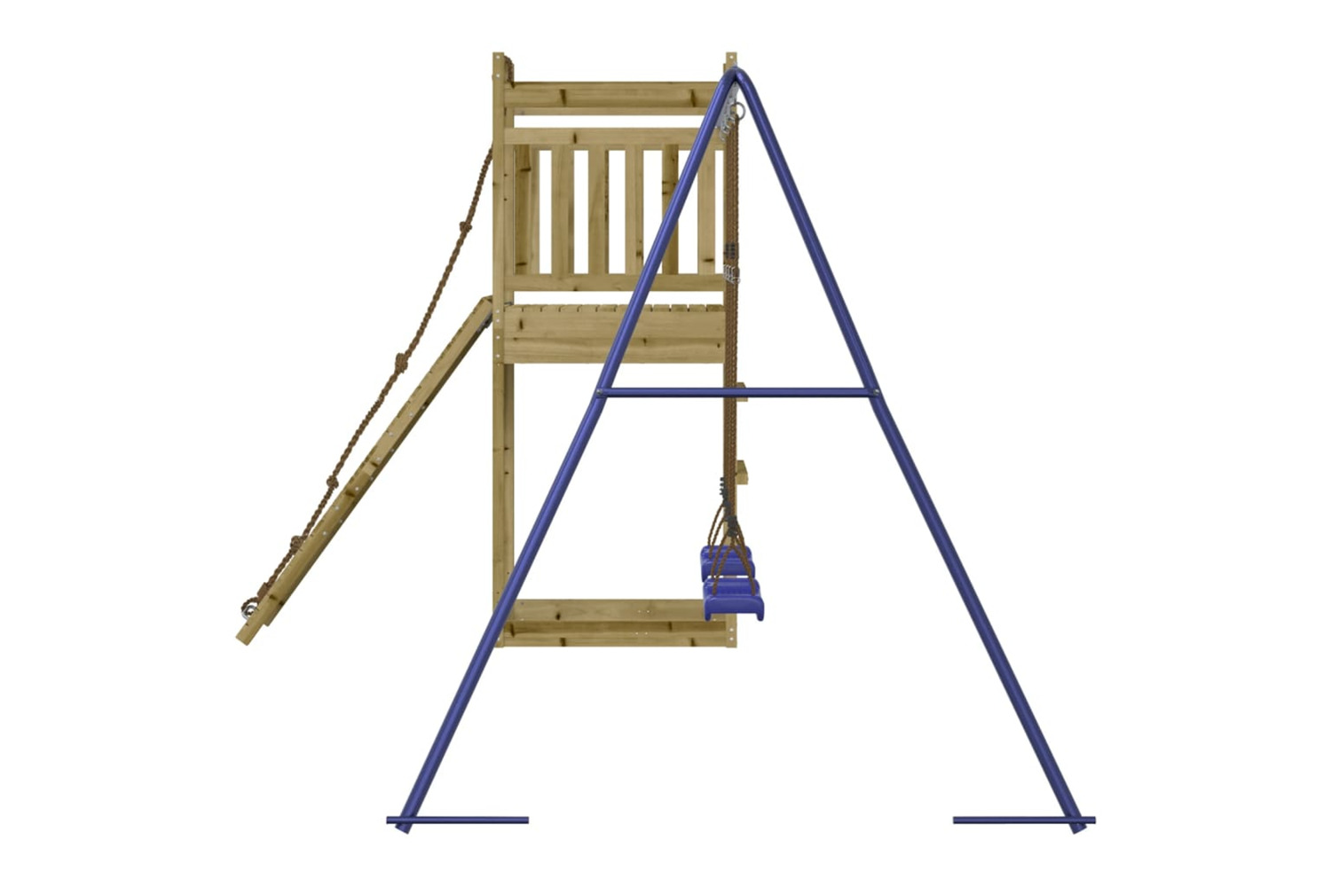 - Durable material: This playset is made of vacuum pressure impregnated pinewood. Solid pine wood is a beautiful natural material. Pine wood has a straight grain, and the knots give the material its signature, rustic look. Impregnation is a preservation process that is carried out by using autoclaves. The pressure-treatment increases resistance to decay and weather.