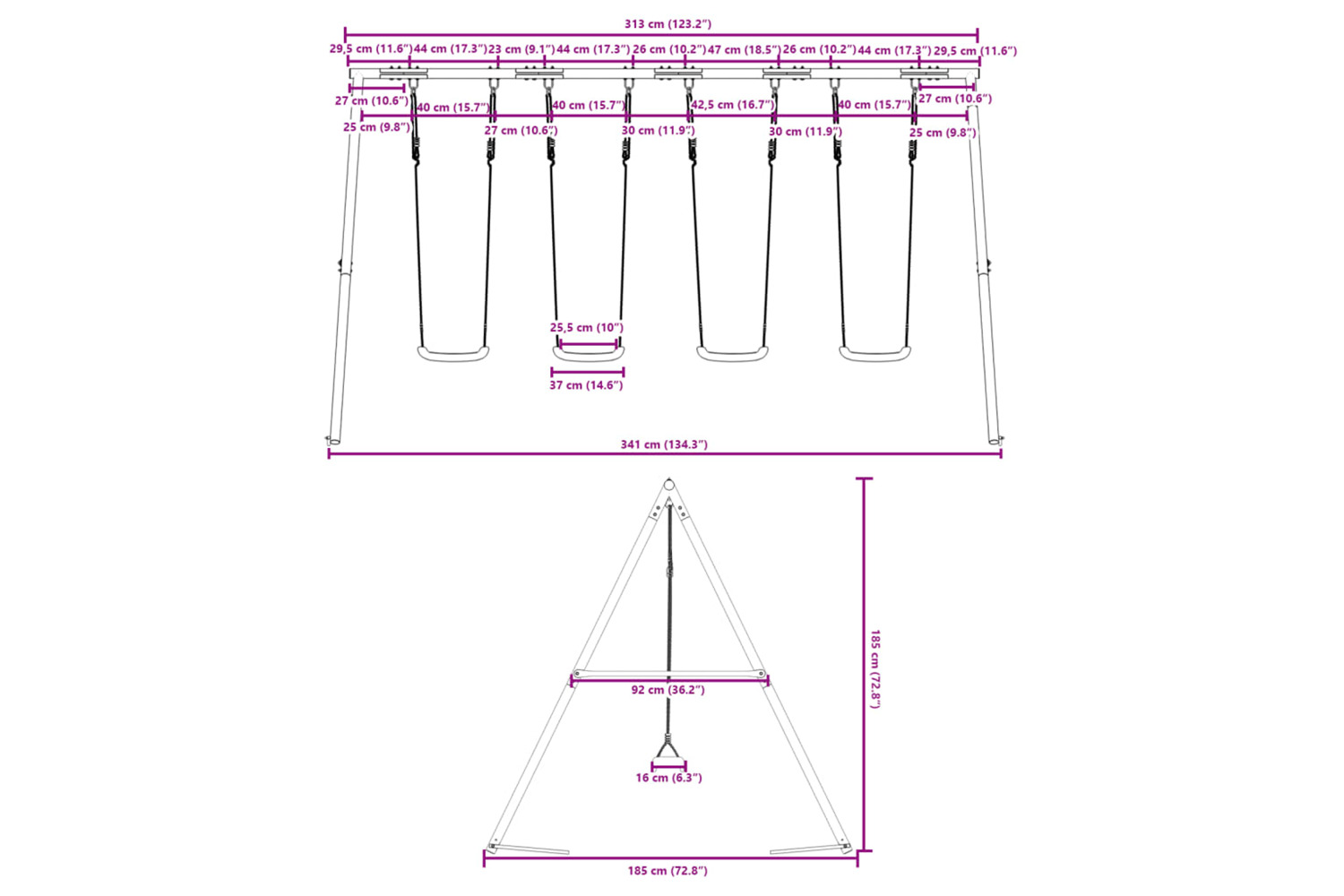 - For safety, please ensure that each swing is for one child at a time.
