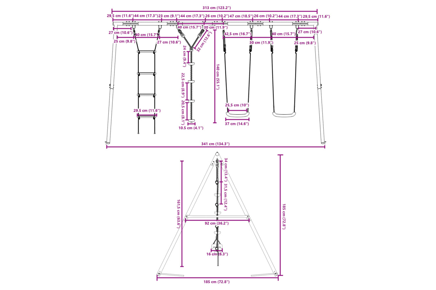 • For safety, please ensure that each swing is for one child at a time.