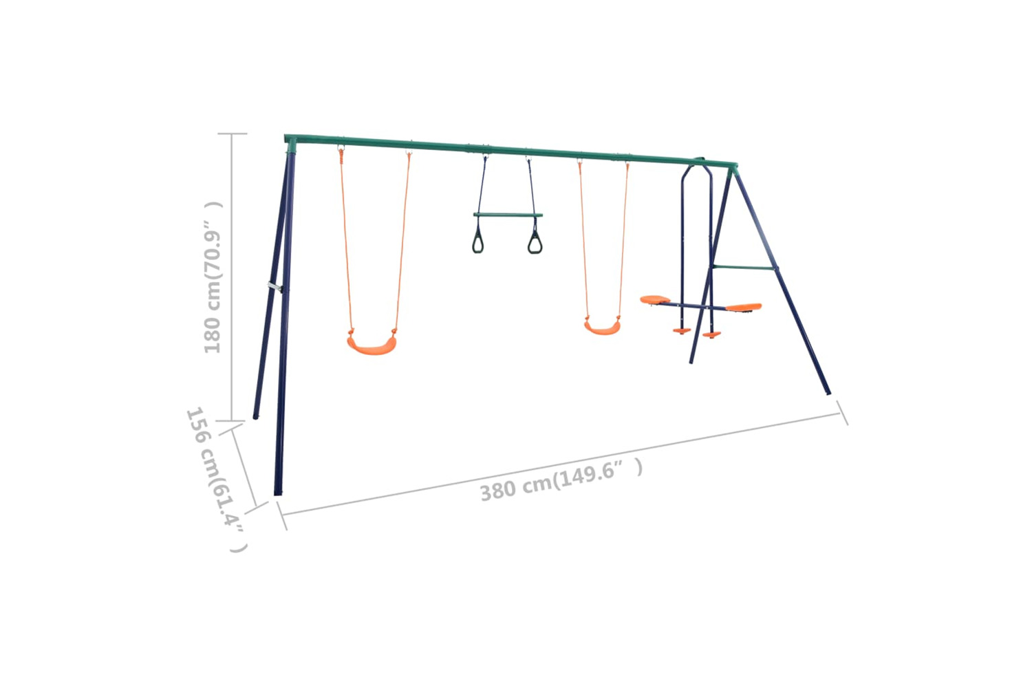 This swing set consists of a sturdy steel A-frame with 2 single swing seats, 2 gymnastic rings and a see saw. The see saw is suitable for two children at the same time. Thanks to its sturdy steel frame and plastic seats, the set is extremely durable and weather-resistant. It is also easy to assemble. All items are securely fixed to the sturdy A-frame crossbar with sturdy brackets, bolts, hooks and ropes.