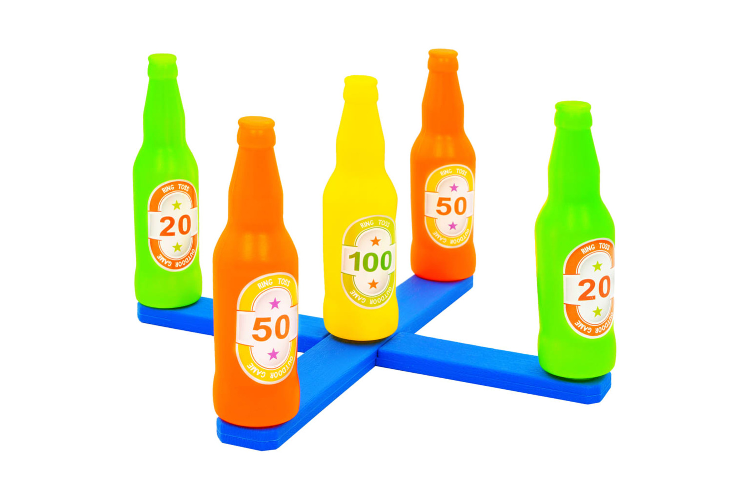 Made from plastic, it's easy to clean and disinfect. Additionally, the ring toss game set is considerably compact and lightweight, making it very easy to transport, assemble, and store. Delivery includes a large target base, 6 rings and 5 bottles.