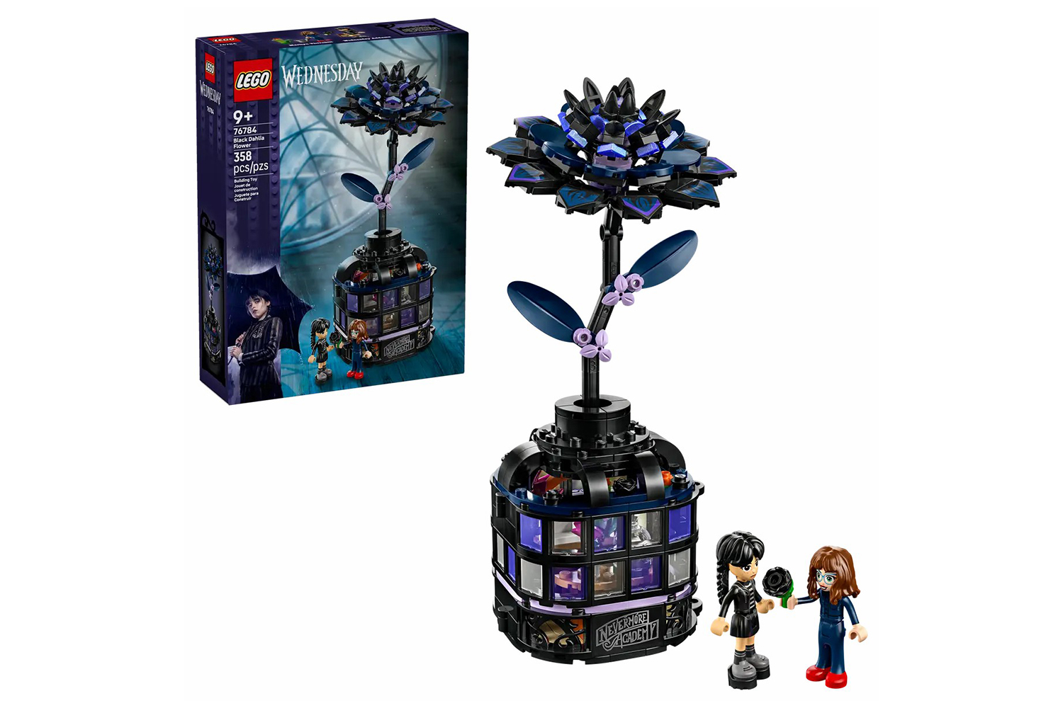 An elegant display for botany fans and design enthusiasts aged 9 and over awaits with this Black Dahlia Flower (76784) LEGO Wednesday building toy. This room decoration features a black dahlia plant with leaves and light purple buds, and a vase that resembles a mini conservatory. Once built, kids remove the dahlia flower to unlock the vase and reveal the classroom inside, which features removable desks, a stool and other storytelling accessories. The set also comes with Wednesday Addams and Professor Marilyn Thornhill minidolls for role-play possibilities.
