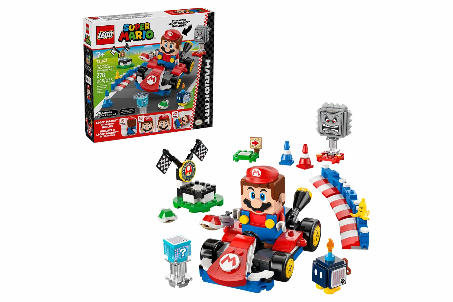 Let kids create their own racetrack and team up with Lego Mario in his standard kart for interactive races with this brick-built mario kart toy playset (72043). A fantastic Lego super mario gift toy for boys, girls and gamers aged 7 years old and up, the building set features an interactive Lego mario toy figure and a standard kart with drifting action and a shell-launching function for racing fun and pretend play. There is a start area, connectible track barriers, traffic cones and a winner’s circle to make a racetrack. Drive the standard kart with Lego mario to trigger mario kart sounds and visual effects, earn digital rewards from the item box, defeat the Bob-omb and Thwomp and see how Lego mario reacts to the green and red Lego plates. Explore the full range of Lego super mario: Mario kart toy playsets (sold separately) for more vehicles and characters to expand the fun. Find building instructions in the box or on the Lego super mario app. This set contains 278 pieces.