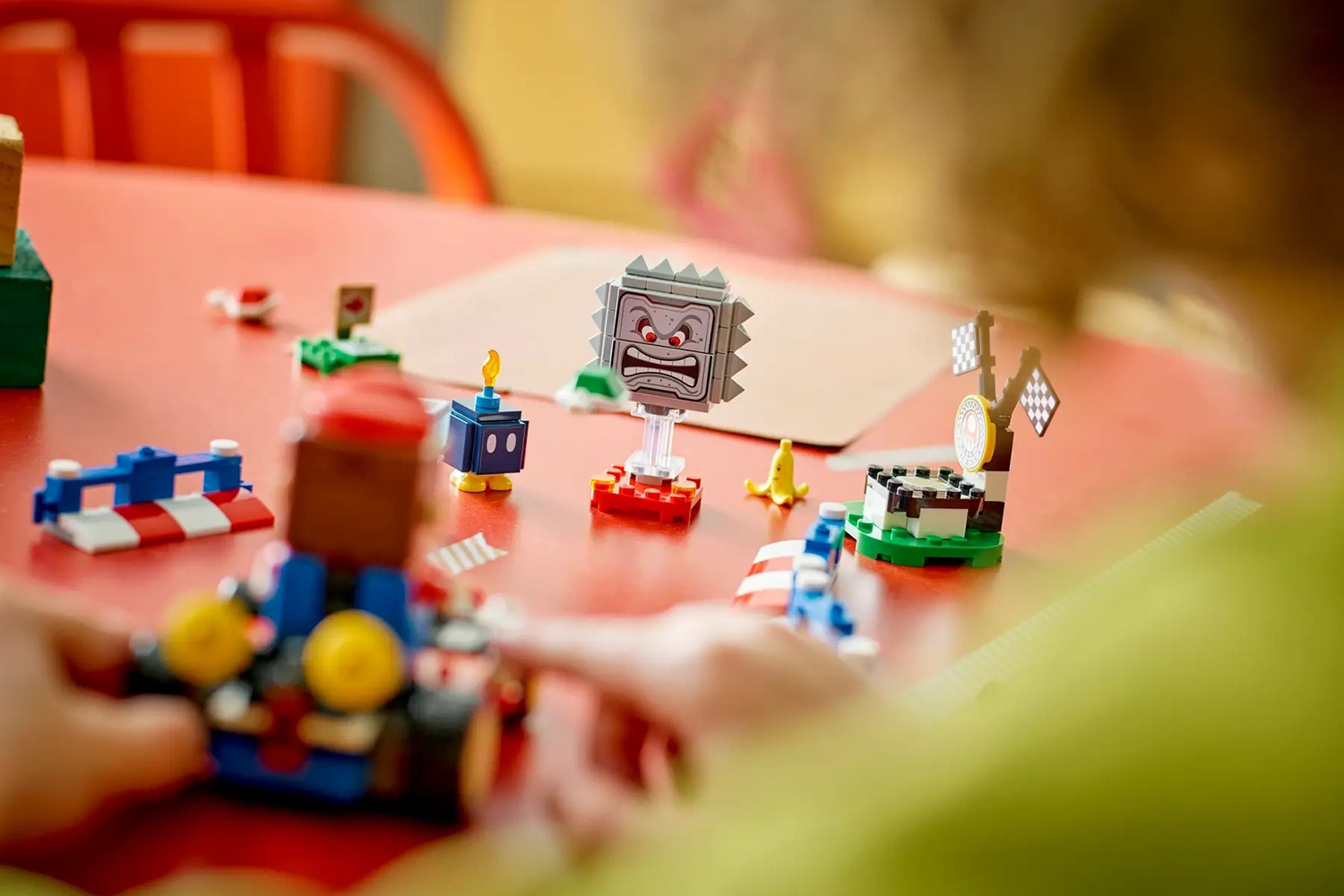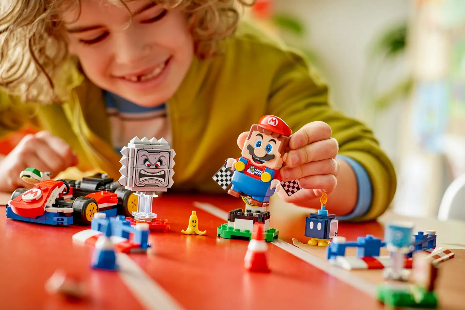 An interactive Lego mario figure, Bob-omb and Thwomp figures, plus a Banana element with face decoration.