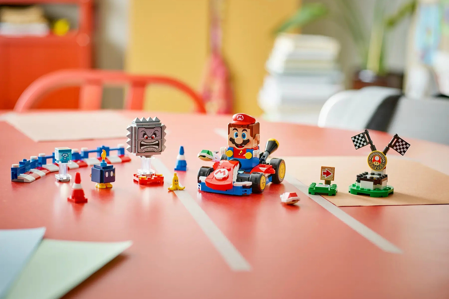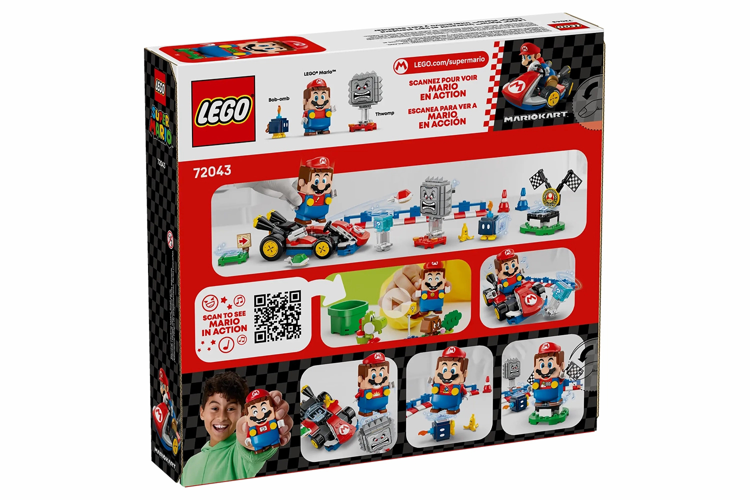 Race the standard kart with Lego mario, earn digital rewards from the item box, defeat the Bob-omb and Thwomp, see how Lego mario reacts to the green and red Lego plates, and more.