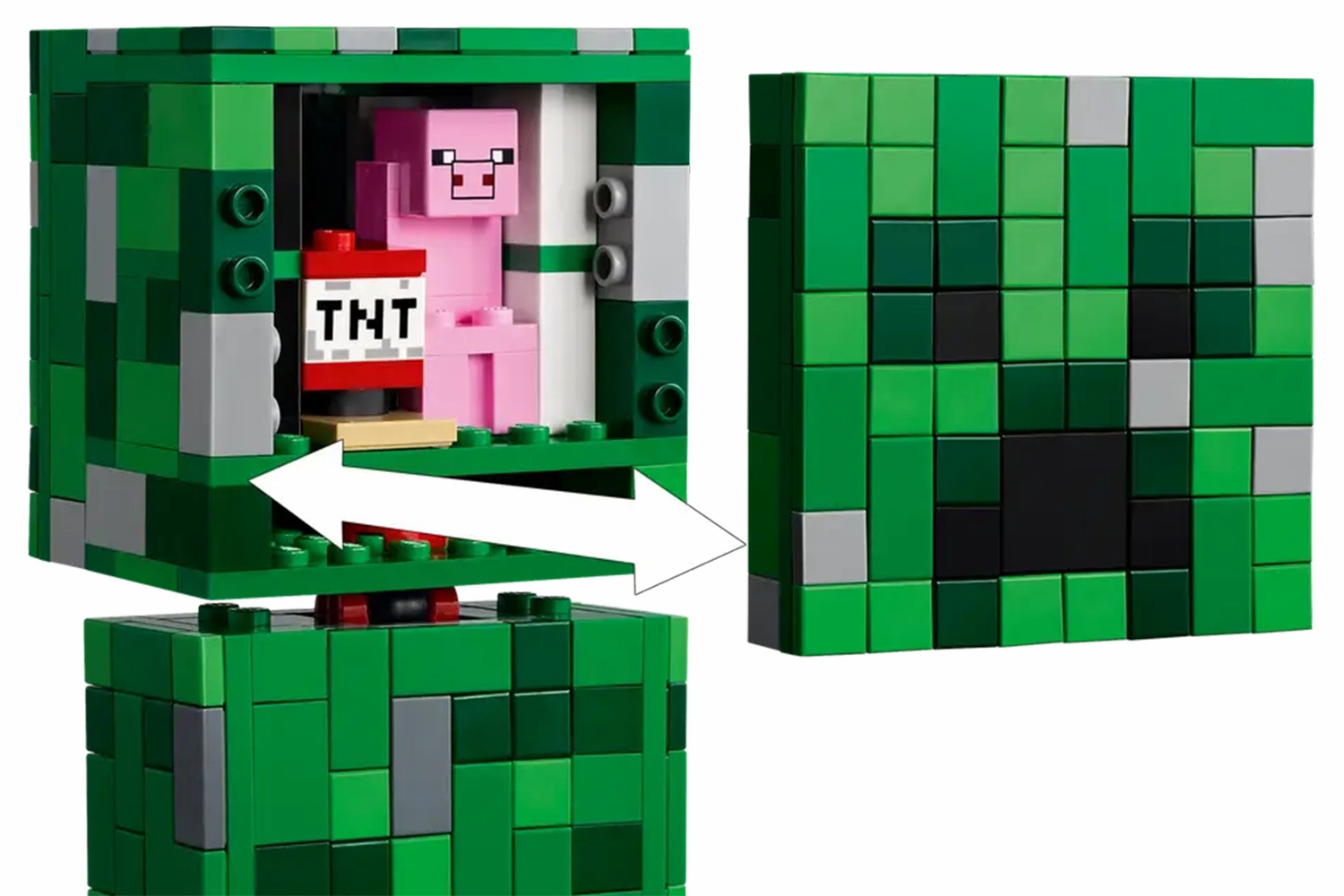 The front of the Lego Minecraft Creeper figure’s head detaches to reveal an interior space containing a first-version Creeper minifigure and a TNT element
