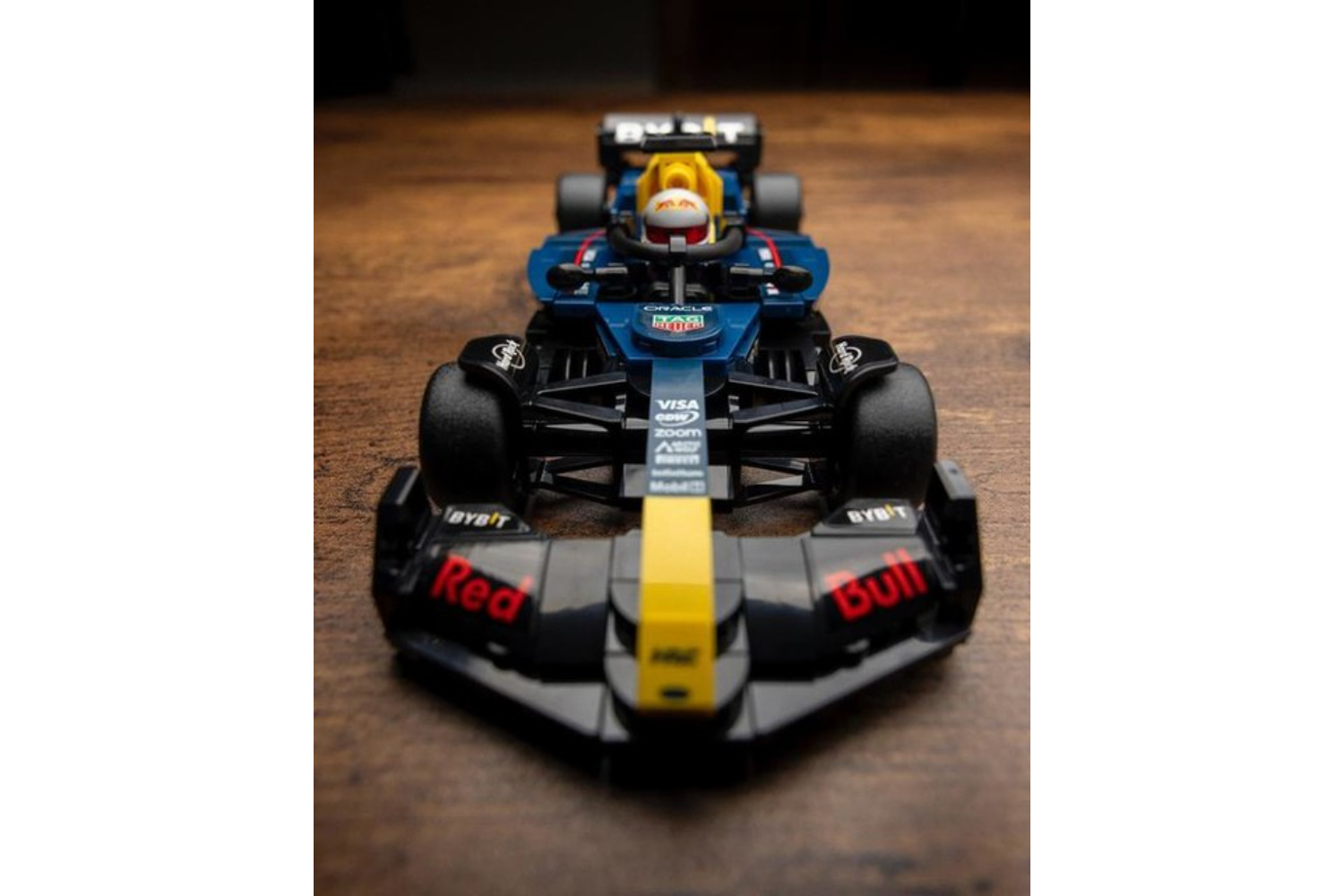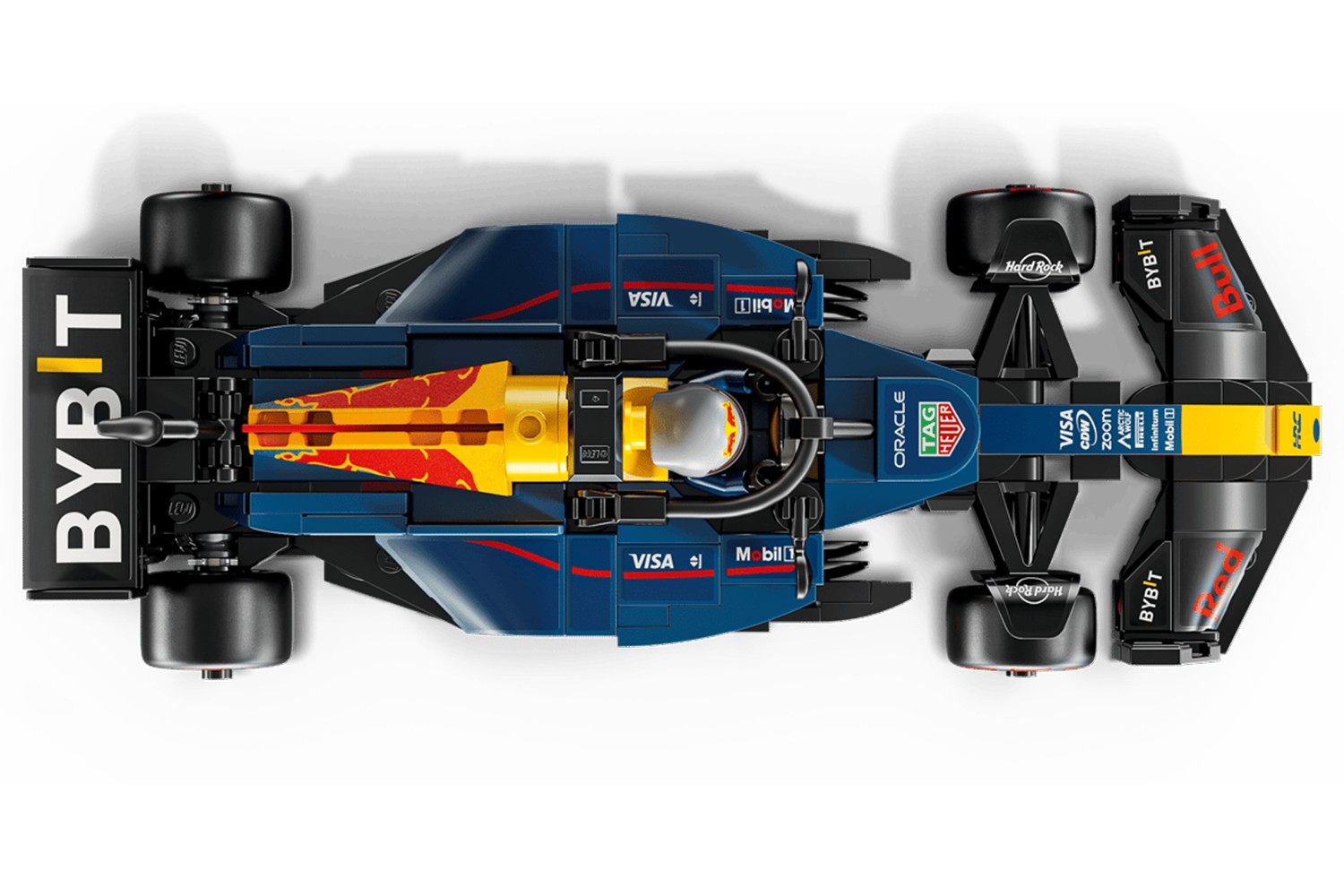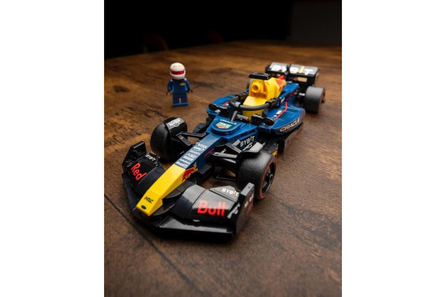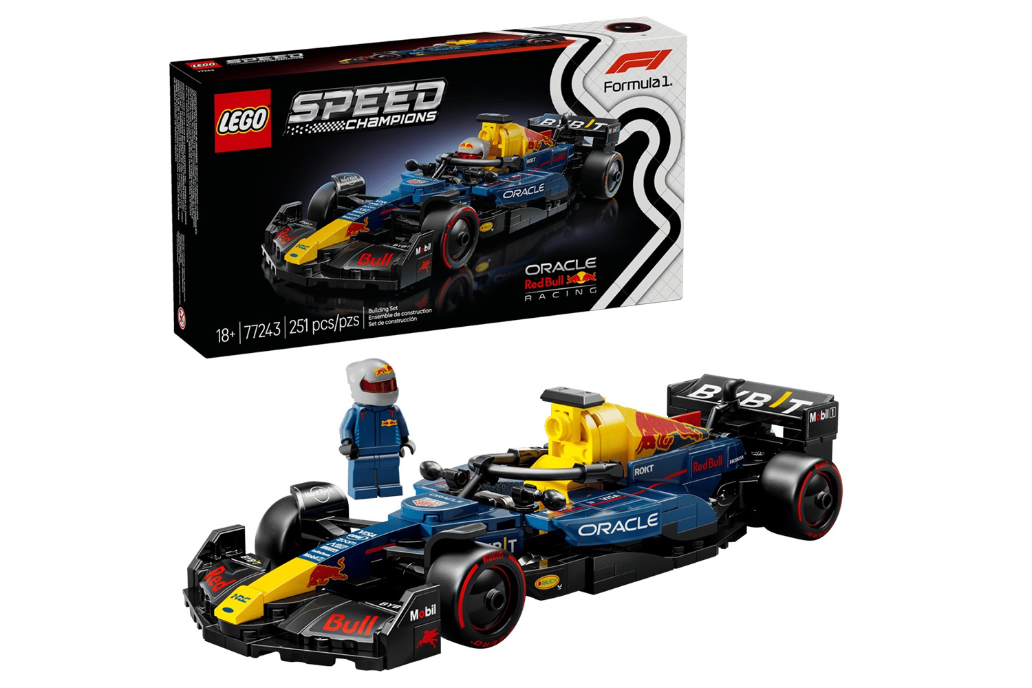 - F1 minifigure – The vehicle kit includes an F1 driver minifigure wearing a Red Bull outfit and a winged helmet to place inside the F1 race car’s cockpit