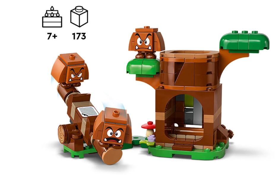 • Lego brick-built adventure toy: Press the lever at the back of the buildable tree trunk to make a Goomba pop out or play with the Goombas on the seesaw.