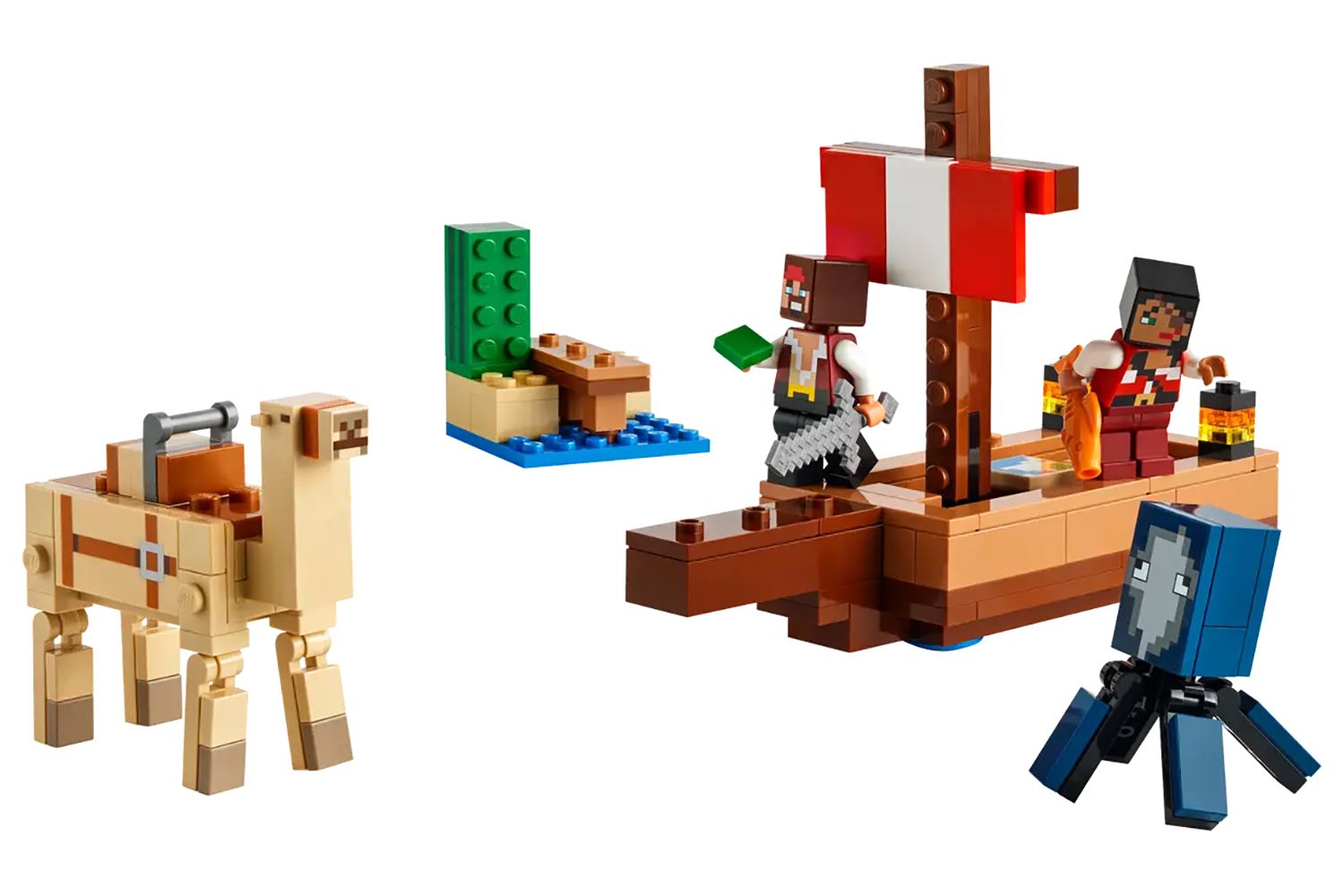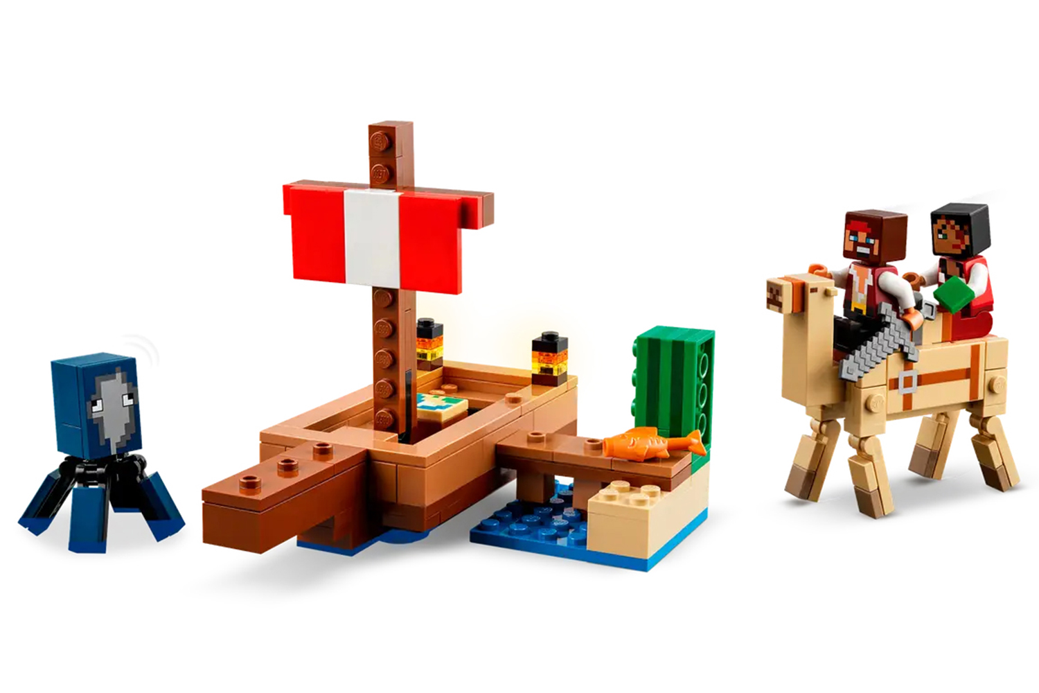 This LEGO Minecraft pirate adventure set includes a buildable vehicle toy, plus a squid, camel, 2 pirate figures and accessories. Featuring pirates and a boat, and the first-ever appearance of an adult LEGO Minecraft camel, this special LEGO set will appeal to Minecraft fans. The camel’s 2-seat saddle has room for both pirates to ride to their next adventure. Accessories, including a fish, map, iron sword and a cactus help inspire imaginative play. The set combines easily with other LEGO Minecraft sets (sold separately) for even more play possibilities.