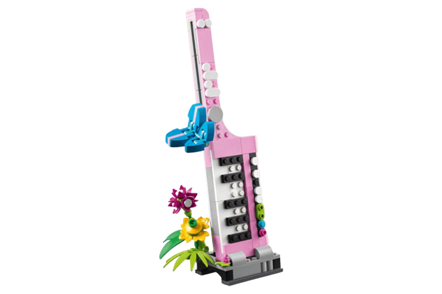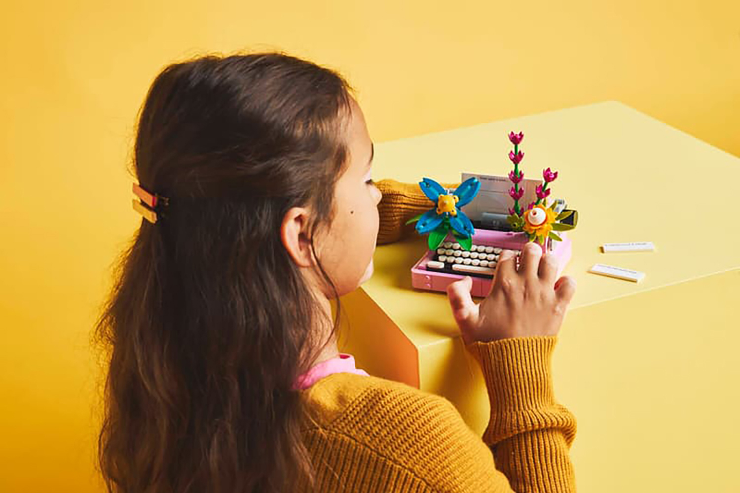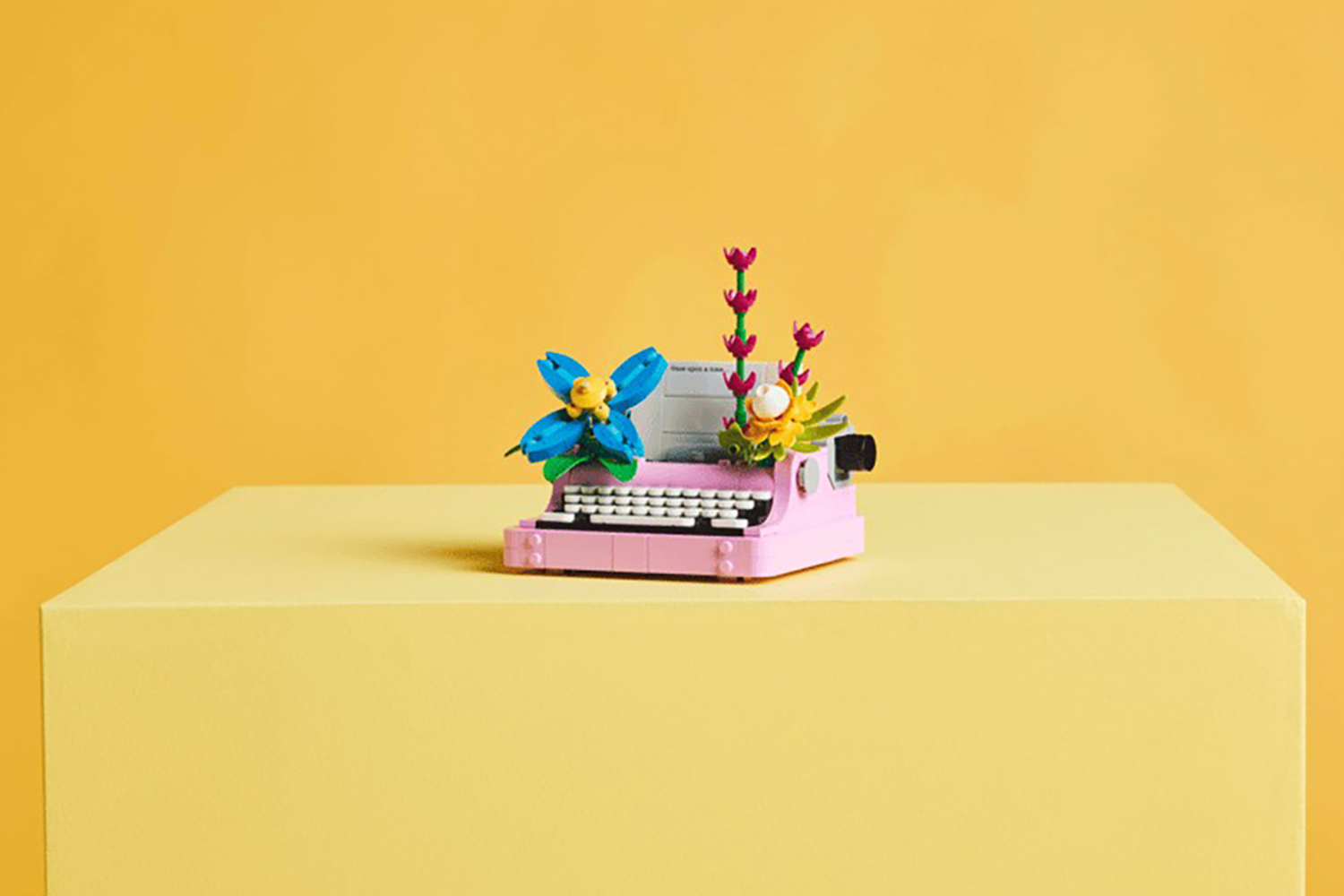 Lego fans have a choice of 3 different flower kits to build: a Typewriter with Flowers toy; a keytar toy instrument on a stand with flowers; or a flowerpot with a pen and notebook. The rebuildable toy playset also comes with 3 stickers featuring thoughtful phrases, which kids can use to decorate the brick-built models.