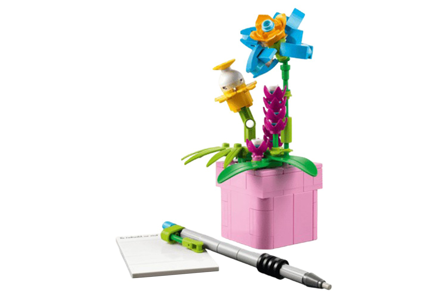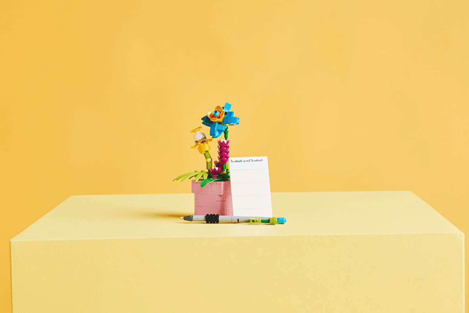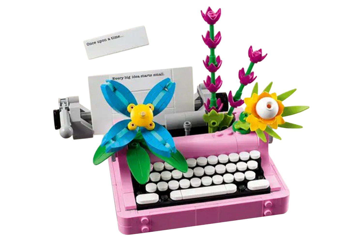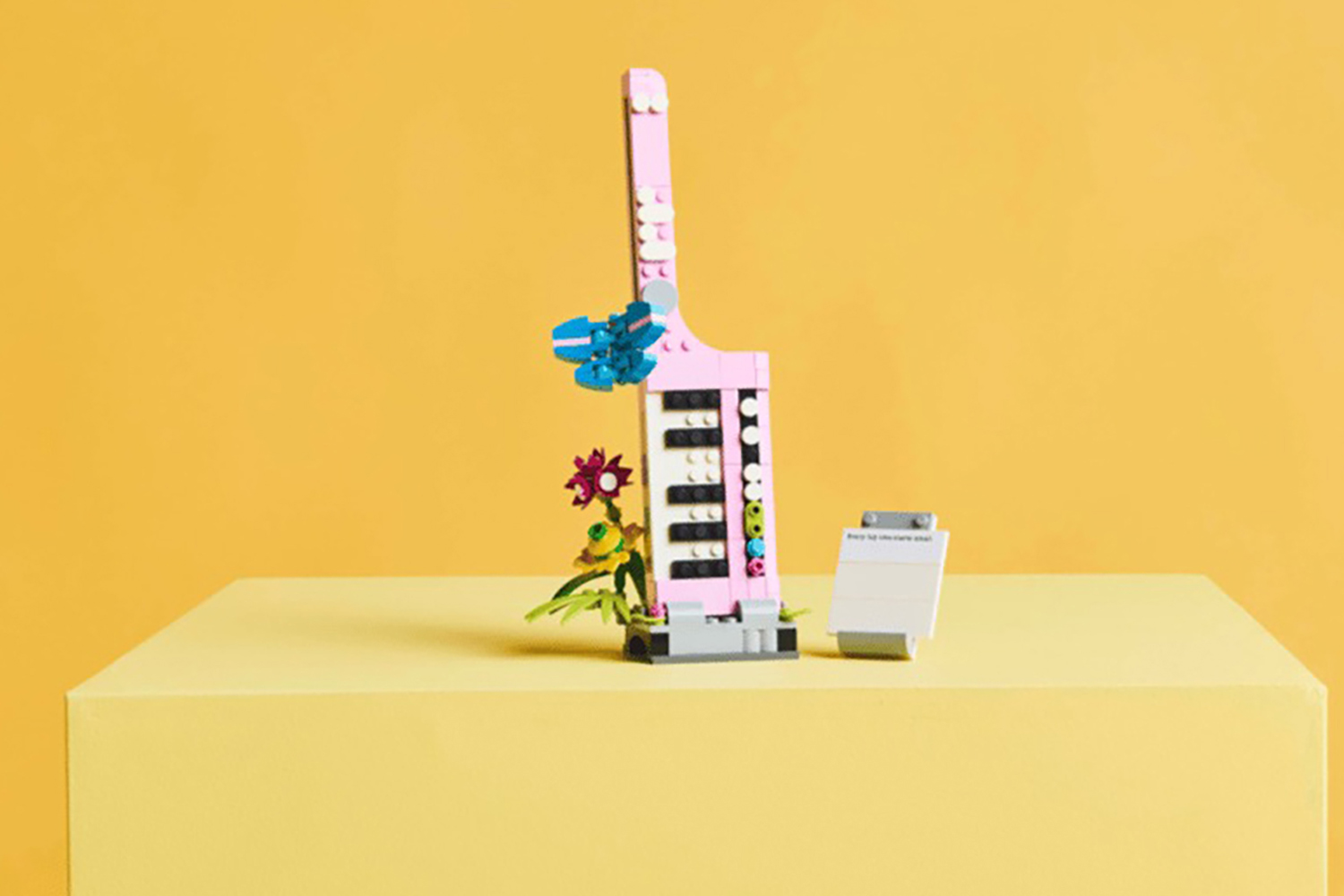 Lego fans have a choice of 3 different flower kits to build: a Typewriter with Flowers toy; a keytar toy instrument on a stand with flowers; or a flowerpot with a pen and notebook. The rebuildable toy playset also comes with 3 stickers featuring thoughtful phrases, which kids can use to decorate the brick-built models.