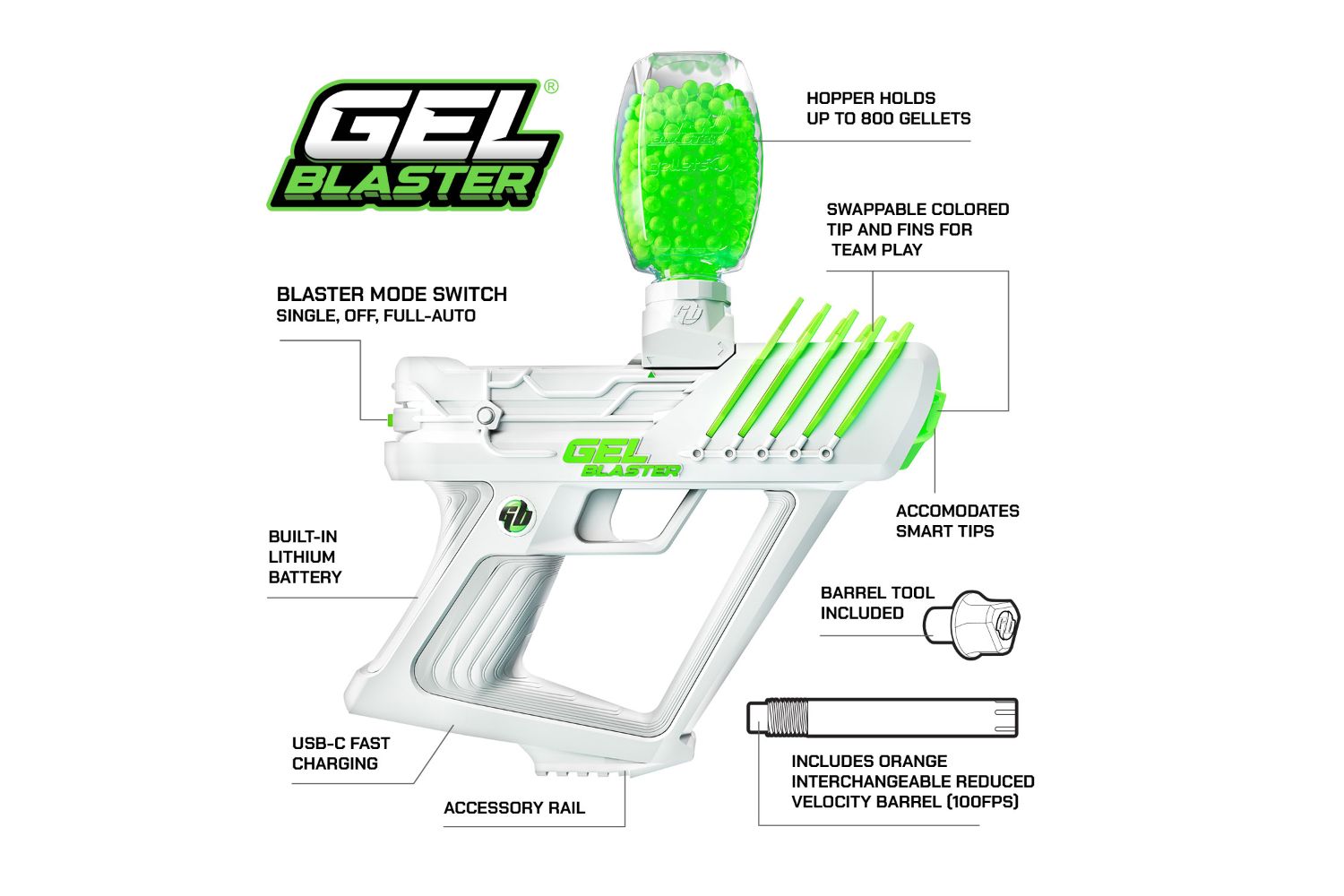 Customize your desired gameplay with two blast modes: Single Shot for honing your precision and training, and Fully Automatic for dominating the competition with a barrage of 10 Gellets per second. You can even swap out the high-velocity barrel for the included low-velocity barrel, reducing the intensity to 90 feet per second for younger players.