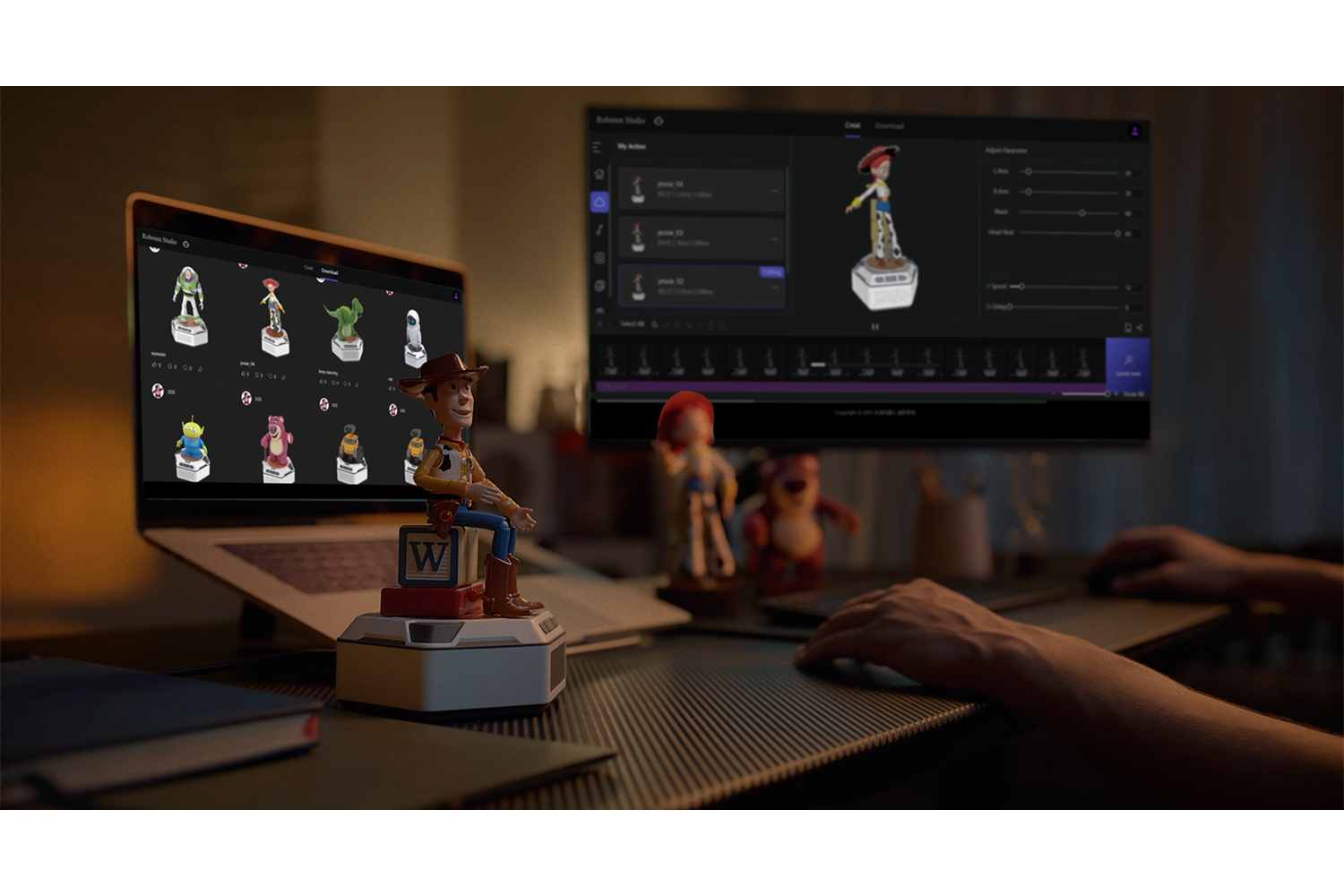 - Six mini robots: Woody, Buzz Lightyear, Alien, Lotso, Jessie, Rex