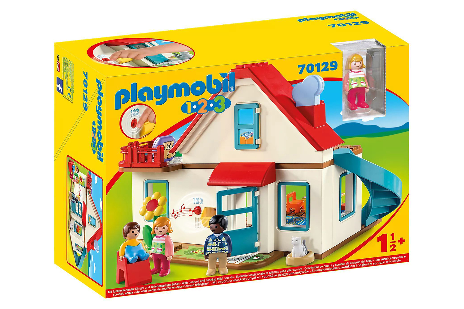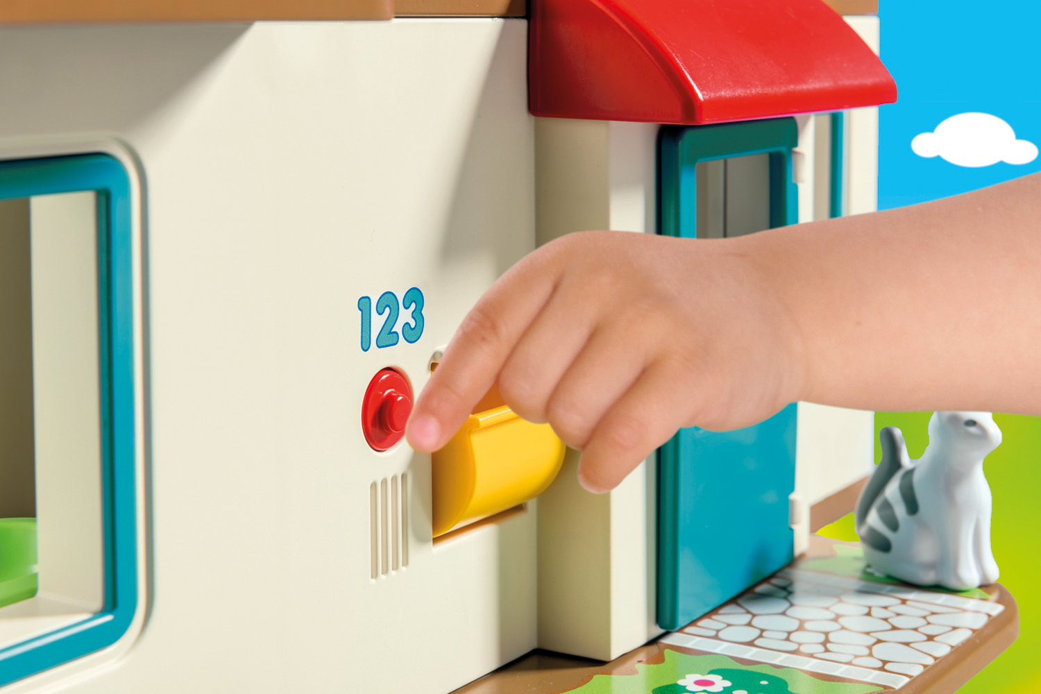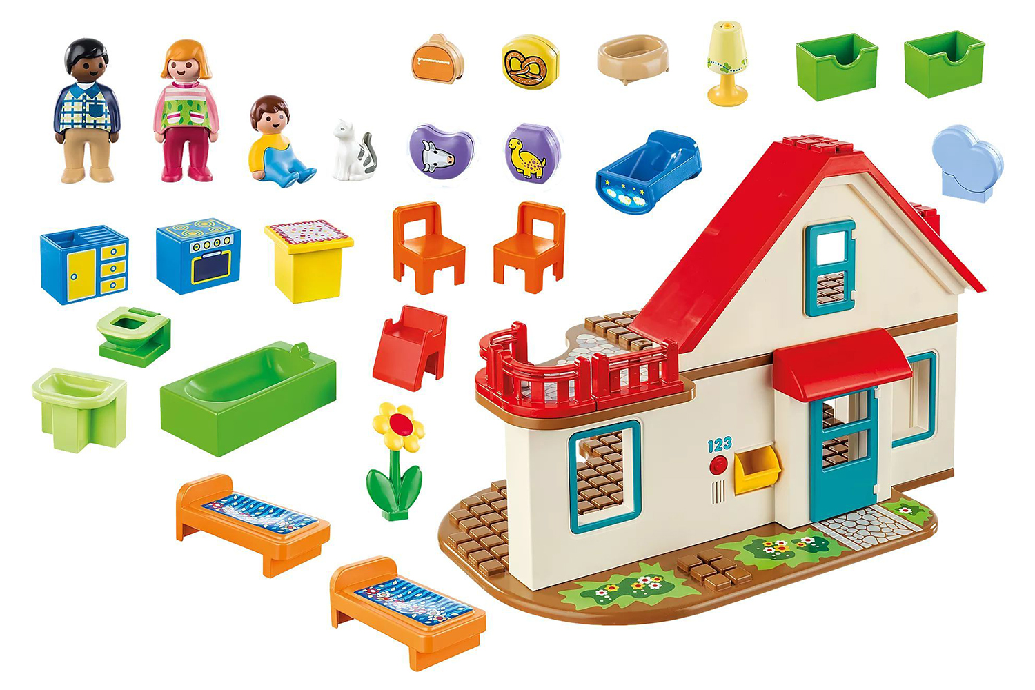 Accessories: 1 detached house, 2 beds, 1 baby cot, 1 bathtub, 1 washbasin, 1 toilet, 1 kitchen cupboard with sink, 1 oven with cooker, 1 table, 2 chairs, 1 high chair, 1 flower, 1 bag, 3 differently printed stones to name objects, 1 cat basket, 1 lamp, 2 drawers, 1 "smoke" plug-in element